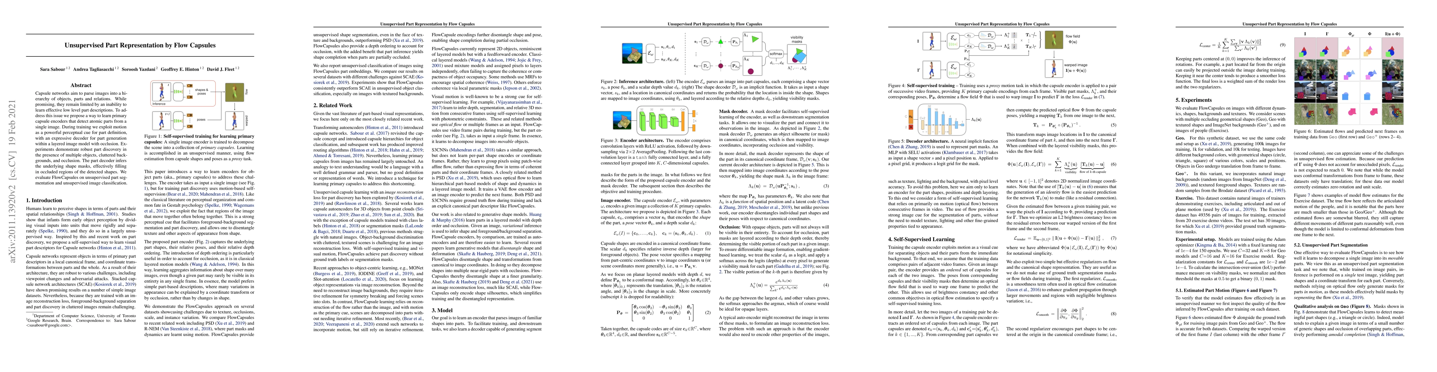 This paper proposes Flow Capsules, a method to learn unsupervised part representations by detecting atomic parts from single images using motion cues and a layered image model. Experiments show robust part discovery and segmentation, even with occlusion, and the method is evaluated for unsupervised part segmentation and image classification.