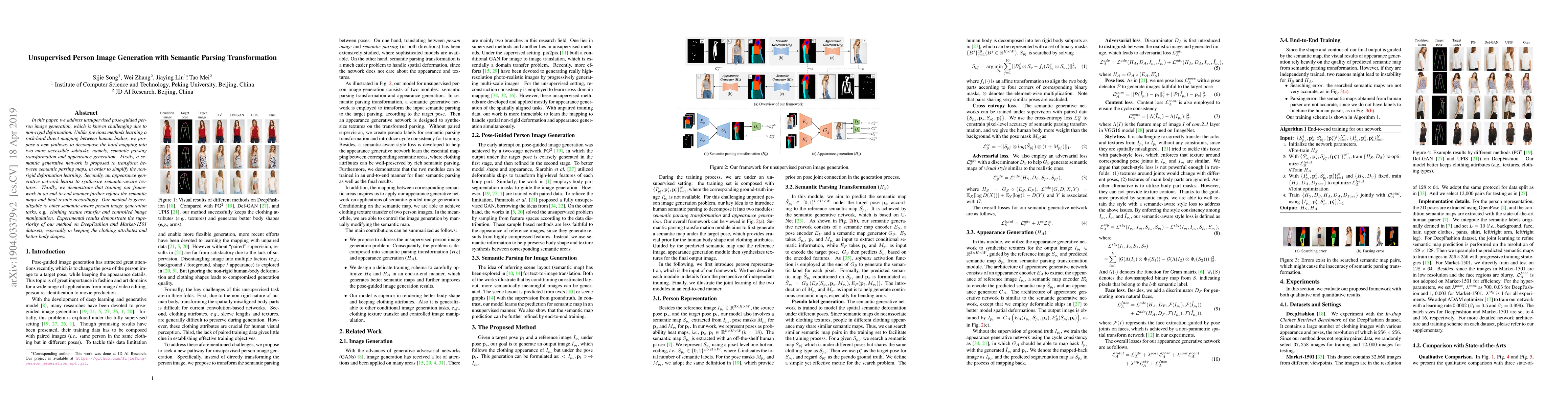 This paper introduces an unsupervised method for pose-guided person image generation, decomposing the task into semantic parsing transformation and appearance generation. The proposed framework trains end-to-end, showing superior results on DeepFashion and Market-1501 datasets by maintaining clothing attributes and better body shapes.