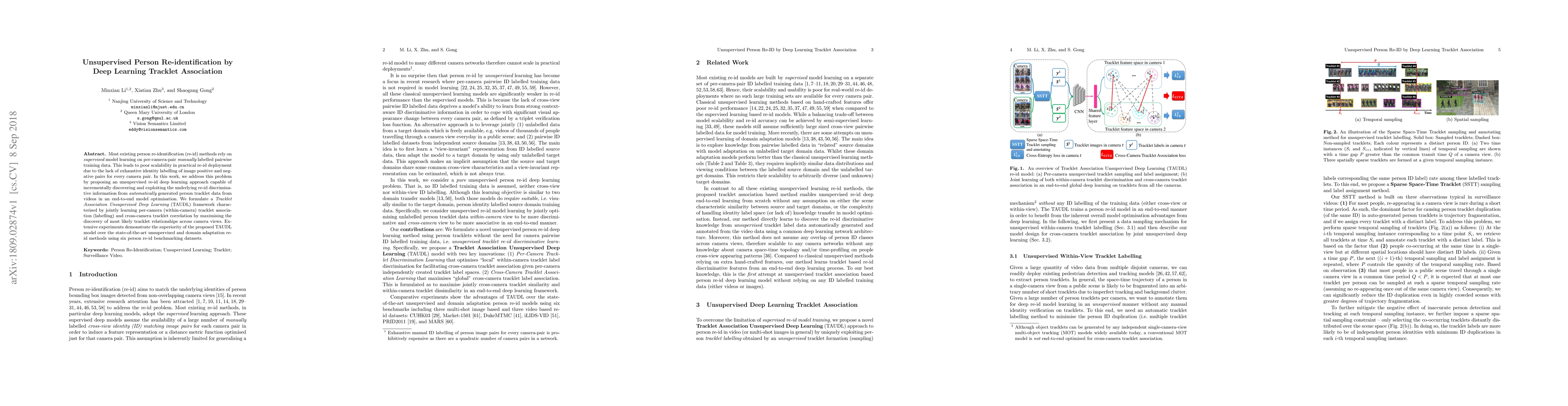 This paper proposes an unsupervised deep learning approach for person re-identification (re-id) that leverages automatically generated tracklet data from videos to discover and exploit discriminative information without requiring manually labelled training data. The Tracklet Association Unsupervised Deep Learning (TAUDL) framework jointly learns within-camera and cross-camera tracklet correlations, demonstrating superior performance over existing unsupervised and domain adaptation methods.