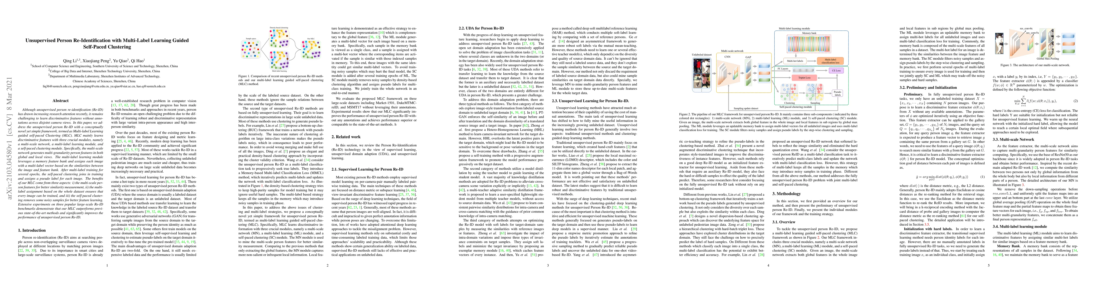 This paper proposes an unsupervised framework called Multi-label Learning guided self-paced Clustering (MLC) for person re-identification, utilizing a multi-scale network, multi-label learning, and self-paced clustering to learn discriminative features without annotations. The MLC framework significantly improves unsupervised person re-identification performance on large-scale benchmarks.