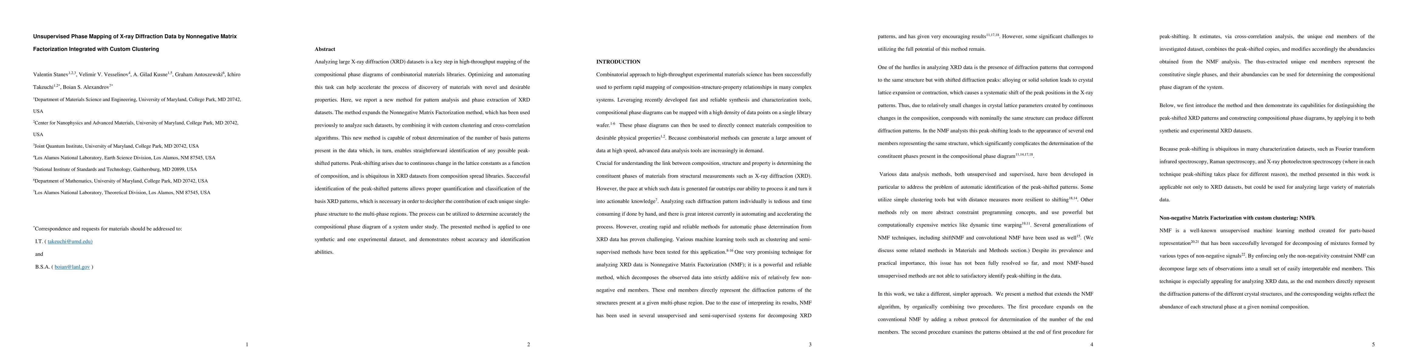 Analyzing large X-ray diffraction (XRD) datasets is a key step in high-throughput mapping of the compositional phase diagrams of combinatorial materials libraries. Optimizing and automating this task can help accelerate the process of discovery of materials with novel and desirable properties. Here, we report a new method for pattern analysis and phase extraction of XRD datasets. The method expands the Nonnegative Matrix Factorization method, which has been used previously to analyze such datasets, by combining it with custom clustering and cross-correlation algorithms. This new method is capable of robust determination of the number of basis patterns present in the data which, in turn, enables straightforward identification of any possible peak-shifted patterns. Peak-shifting arises due to continuous change in the lattice constants as a function of composition, and is ubiquitous in XRD datasets from composition spread libraries. Successful identification of the peak-shifted patterns allows proper quantification and classification of the basis XRD patterns, which is necessary in order to decipher the contribution of each unique single-phase structure to the multi-phase regions. The process can be utilized to determine accurately the compositional phase diagram of a system under study. The presented method is applied to one synthetic and one experimental dataset, and demonstrates robust accuracy and identification abilities.