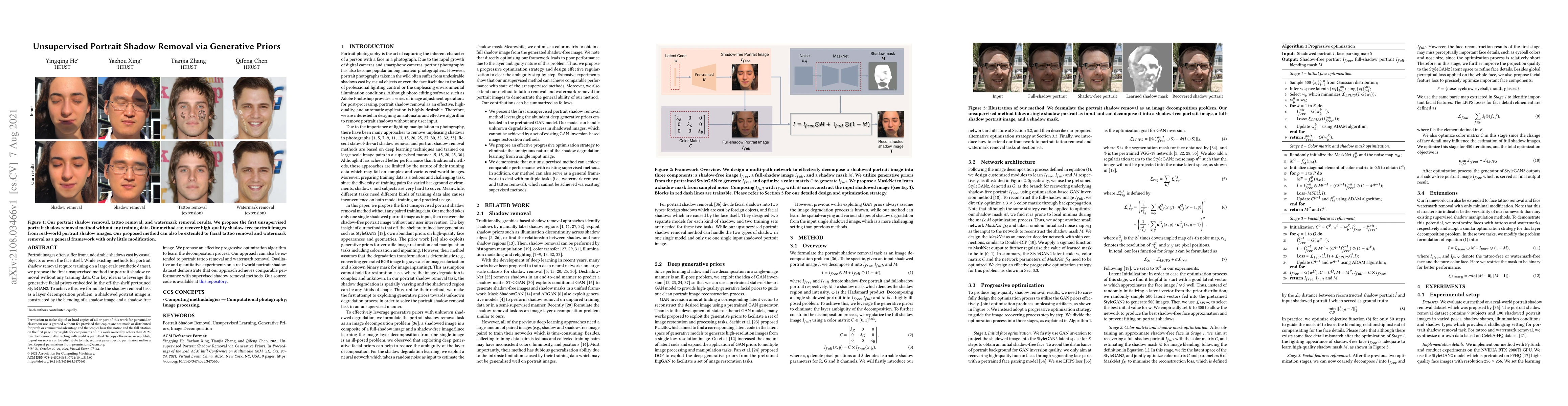 This paper introduces an unsupervised method for portrait shadow removal using generative facial priors from pretrained StyleGAN2, without requiring training data. The approach decomposes shadowed portraits into shadow and shadow-free layers via a progressive optimization algorithm, achieving performance comparable to supervised methods.