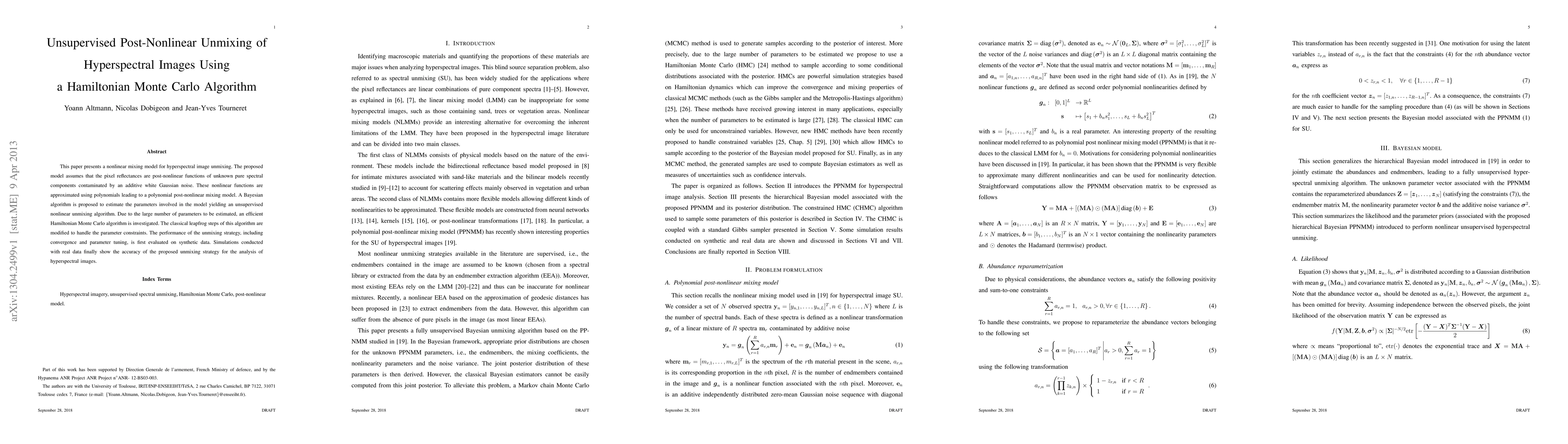 This paper proposes an unsupervised nonlinear unmixing model for hyperspectral images using a polynomial approximation of post-nonlinear mixing functions. A Bayesian Hamiltonian Monte Carlo algorithm is developed to efficiently estimate model parameters, demonstrating accuracy in both synthetic and real data simulations.