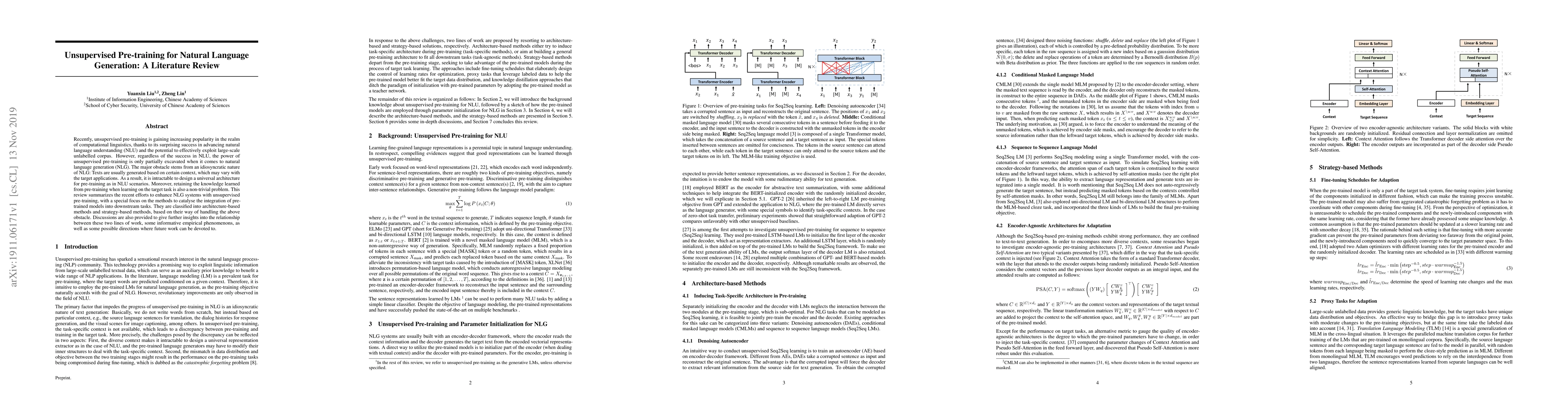 This paper reviews recent advancements in unsupervised pre-training for natural language generation (NLG), highlighting methods to integrate pre-trained models into specific tasks. It classifies these methods into architecture-based and strategy-based approaches, discussing their effectiveness and potential future directions.