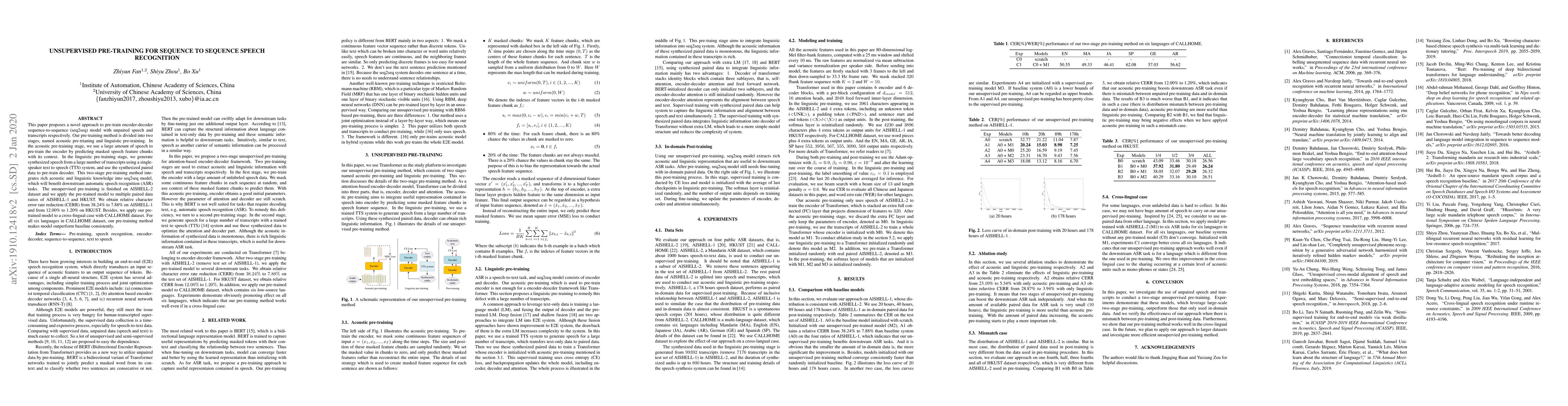 This paper proposes a novel approach to pre-train encoder-decoder sequence-to-sequence (seq2seq) model with unpaired speech and transcripts respectively. Our pre-training method is divided into two stages, named acoustic pre-trianing and linguistic pre-training. In the acoustic pre-training stage, we use a large amount of speech to pre-train the encoder by predicting masked speech feature chunks with its context. In the linguistic pre-training stage, we generate synthesized speech from a large number of transcripts using a single-speaker text to speech (TTS) system, and use the synthesized paired data to pre-train decoder. This two-stage pre-training method integrates rich acoustic and linguistic knowledge into seq2seq model, which will benefit downstream automatic speech recognition (ASR) tasks. The unsupervised pre-training is finished on AISHELL-2 dataset and we apply the pre-trained model to multiple paired data ratios of AISHELL-1 and HKUST. We obtain relative character error rate reduction (CERR) from 38.24% to 7.88% on AISHELL-1 and from 12.00% to 1.20% on HKUST. Besides, we apply our pretrained model to a cross-lingual case with CALLHOME dataset. For all six languages in CALLHOME dataset, our pre-training method makes model outperform baseline consistently.