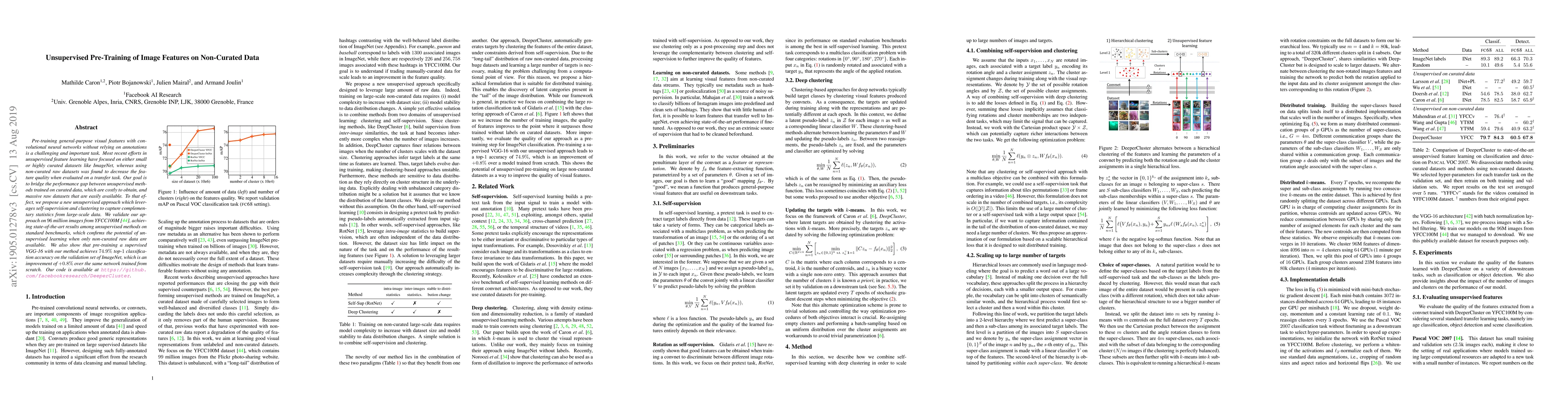 This paper proposes an unsupervised method for pre-training visual features using self-supervision and clustering on large-scale, uncurated datasets like YFCC100M. It achieves state-of-the-art results on standard benchmarks, demonstrating the effectiveness of unsupervised learning on raw data.