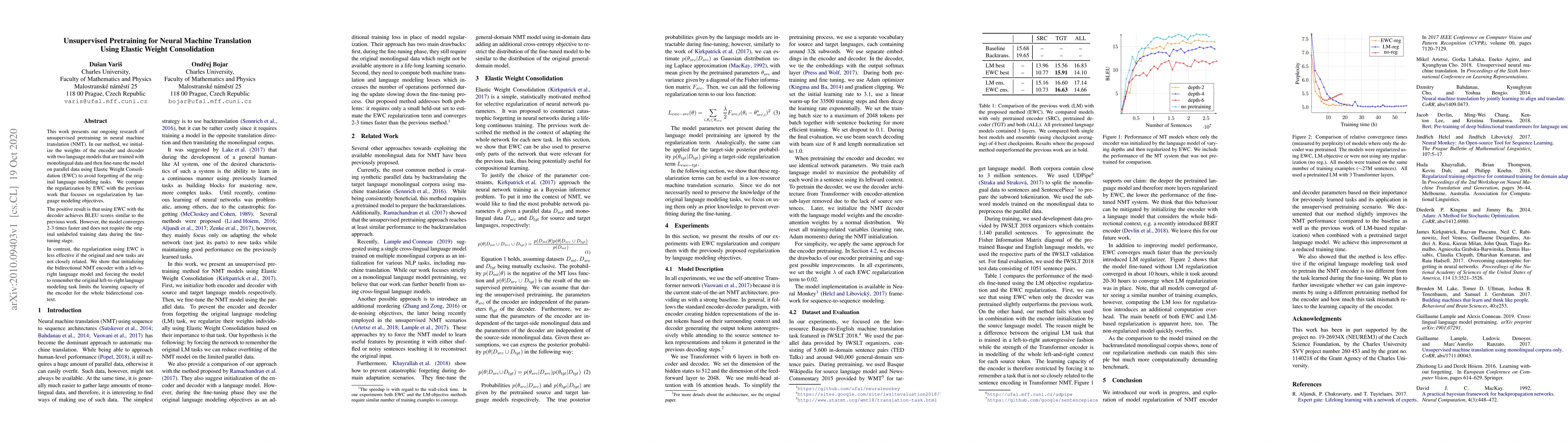 This paper explores unsupervised pretraining in neural machine translation using Elastic Weight Consolidation (EWC) to prevent forgetting of initial language modeling tasks. The model converges faster and does not need original unlabeled data during fine-tuning, achieving similar BLEU scores compared to previous methods. However, EWC is less effective for unrelated tasks.