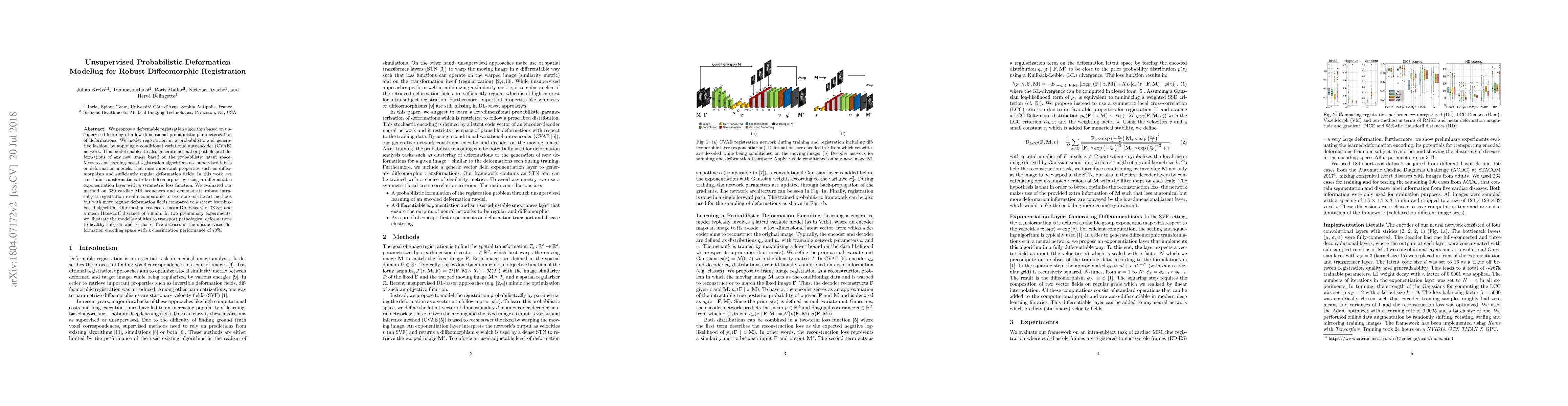 We propose a deformable registration algorithm based on unsupervised learning of a low-dimensional probabilistic parameterization of deformations. We model registration in a probabilistic and generative fashion, by applying a conditional variational autoencoder (CVAE) network. This model enables to also generate normal or pathological deformations of any new image based on the probabilistic latent space. Most recent learning-based registration algorithms use supervised labels or deformation models, that miss important properties such as diffeomorphism and sufficiently regular deformation fields. In this work, we constrain transformations to be diffeomorphic by using a differentiable exponentiation layer with a symmetric loss function. We evaluated our method on 330 cardiac MR sequences and demonstrate robust intra-subject registration results comparable to two state-of-the-art methods but with more regular deformation fields compared to a recent learning-based algorithm. Our method reached a mean DICE score of 78.3% and a mean Hausdorff distance of 7.9mm. In two preliminary experiments, we illustrate the model's abilities to transport pathological deformations to healthy subjects and to cluster five diseases in the unsupervised deformation encoding space with a classification performance of 70%.
