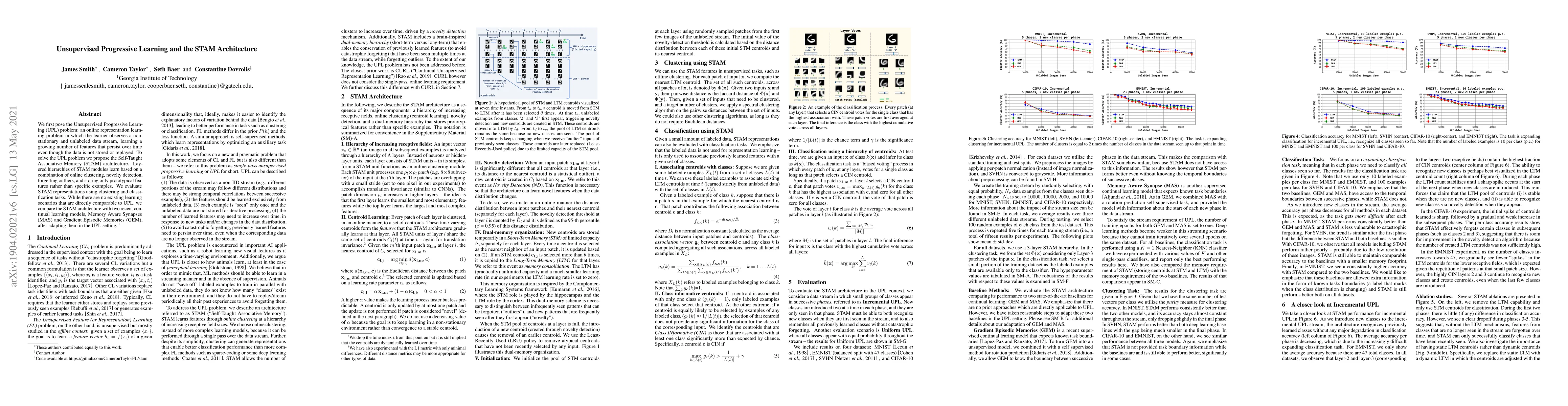This paper introduces the Unsupervised Progressive Learning (UPL) problem, proposing the Self-Taught Associative Memory (STAM) architecture to address it. STAM employs online clustering and novelty detection to learn evolving features from a non-stationary, unlabeled data stream without replaying data.