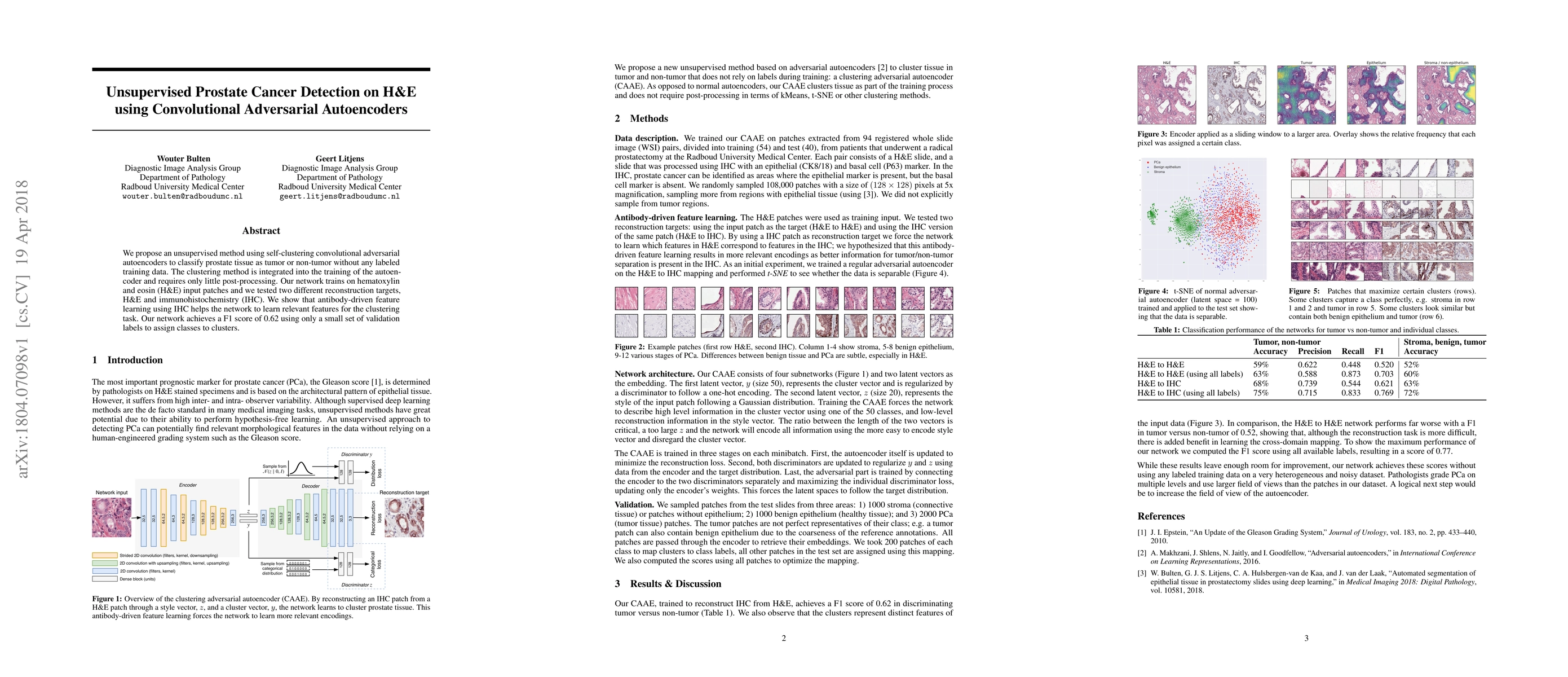 This paper presents an unsupervised method for detecting prostate cancer using self-clustering convolutional adversarial autoencoders trained on H&E tissue patches without labeled data. The network achieves a F1 score of 0.62, with antibody-driven feature learning from IHC aiding in relevant feature extraction.
