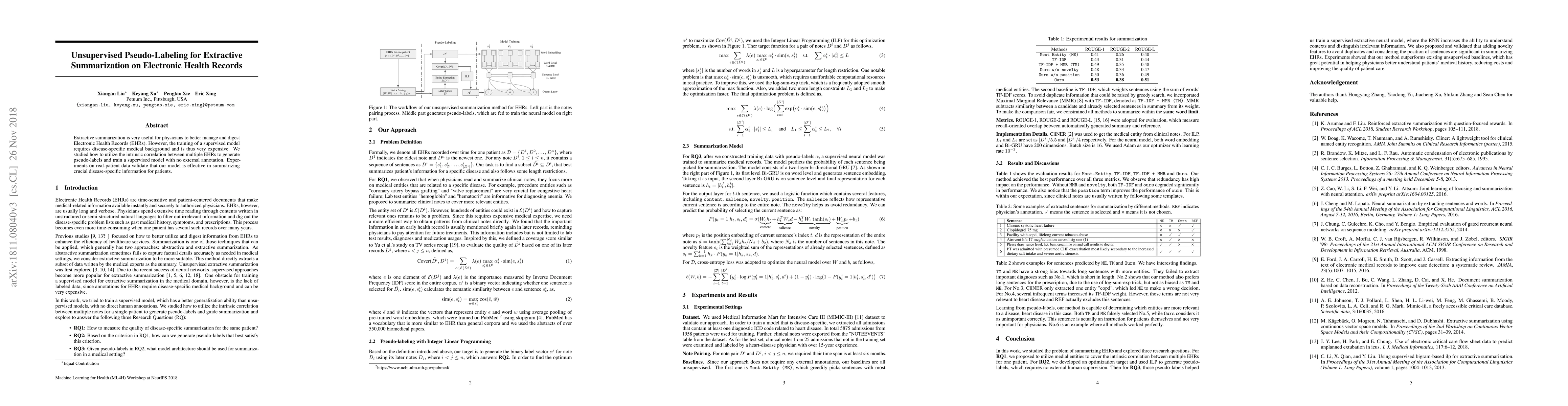 Extractive summarization is very useful for physicians to better manage and digest Electronic Health Records (EHRs). However, the training of a supervised model requires disease-specific medical background and is thus very expensive. We studied how to utilize the intrinsic correlation between multiple EHRs to generate pseudo-labels and train a supervised model with no external annotation. Experiments on real-patient data validate that our model is effective in summarizing crucial disease-specific information for patients.