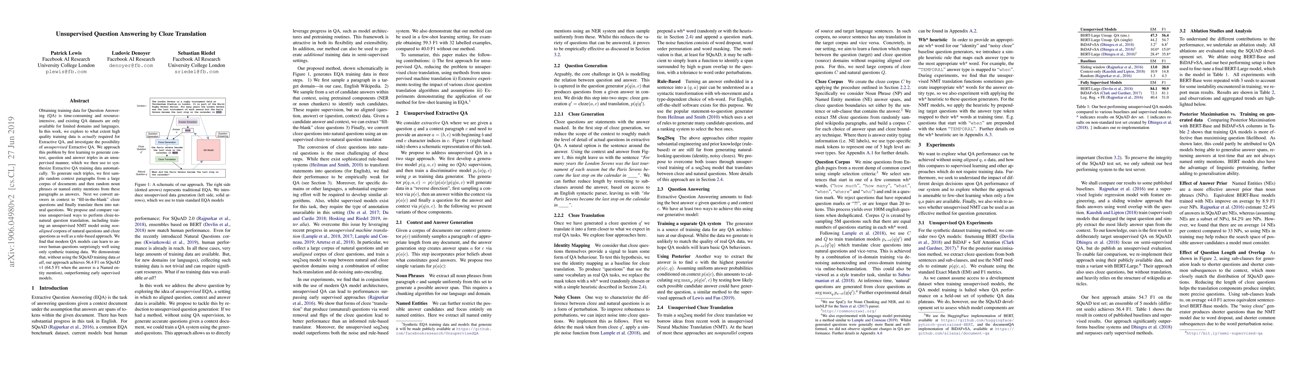 This paper investigates unsupervised Extractive Question Answering (QA) by generating synthetic training data through cloze translation. The authors create context, question, and answer triples from large text corpora and demonstrate that modern QA models can perform well using only this synthetic data, achieving 56.4 F1 on SQuAD v1 without any supervised training data.