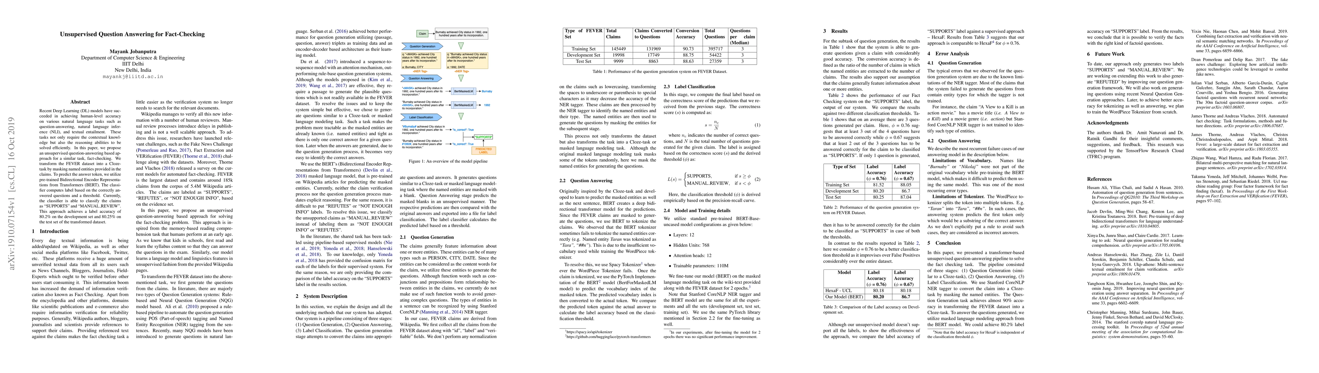 Recent Deep Learning (DL) models have succeeded in achieving human-level accuracy on various natural language tasks such as question-answering, natural language inference (NLI), and textual entailment. These tasks not only require the contextual knowledge but also the reasoning abilities to be solved efficiently. In this paper, we propose an unsupervised question-answering based approach for a similar task, fact-checking. We transform the FEVER dataset into a Cloze-task by masking named entities provided in the claims. To predict the answer token, we utilize pre-trained Bidirectional Encoder Representations from Transformers (BERT). The classifier computes label based on the correctly answered questions and a threshold. Currently, the classifier is able to classify the claims as "SUPPORTS" and "MANUAL_REVIEW". This approach achieves a label accuracy of 80.2% on the development set and 80.25% on the test set of the transformed dataset.