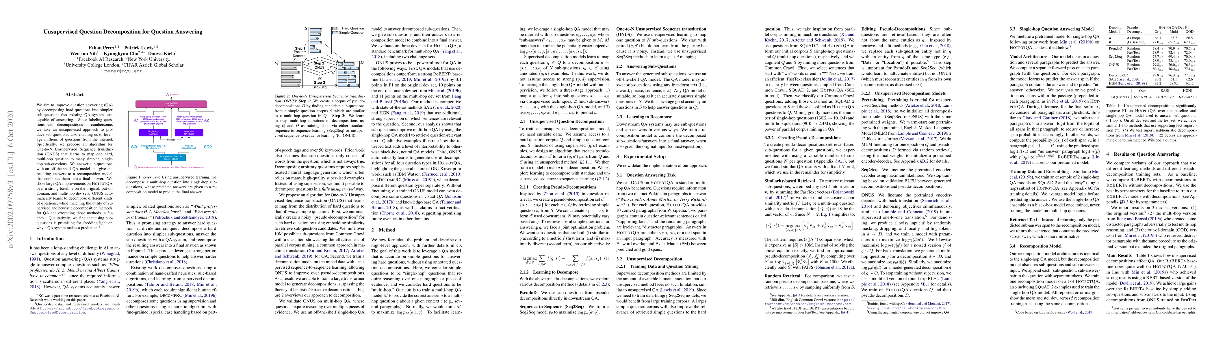 This paper proposes an unsupervised method for decomposing complex questions into simpler sub-questions to enhance question answering systems. The ONUS algorithm maps multi-hop questions to single-hop sub-questions, which are then answered and recombined to form a final response, showing significant improvements over baselines.