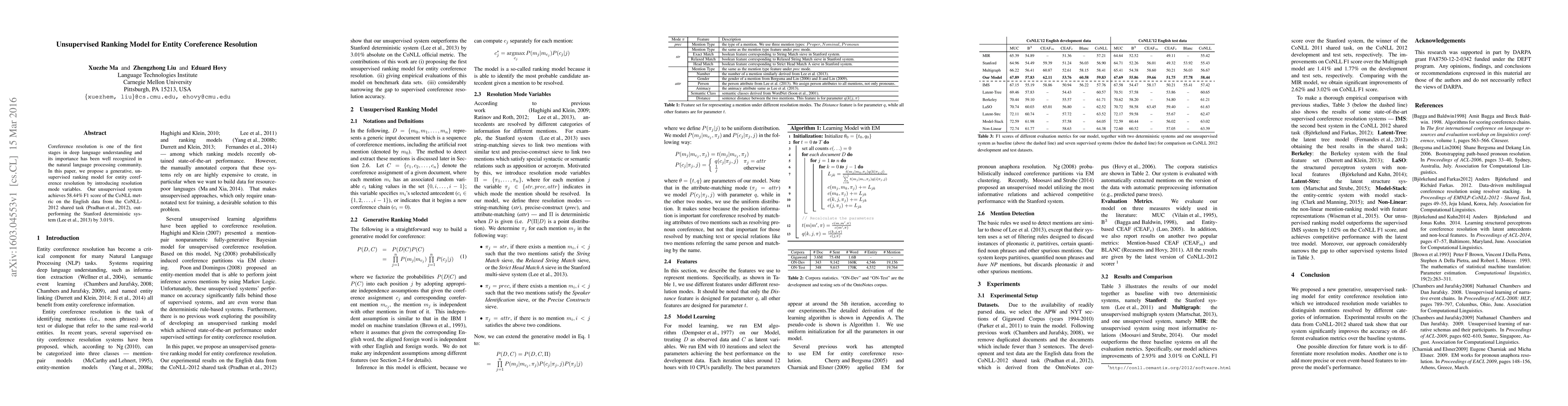This paper presents an unsupervised ranking model for entity coreference resolution that uses generative resolution mode variables, achieving a 58.44% F1 score on CoNLL-2012 data, outperforming the Stanford deterministic system by 3.01%. The method demonstrates the effectiveness of unsupervised approaches in coreference resolution.