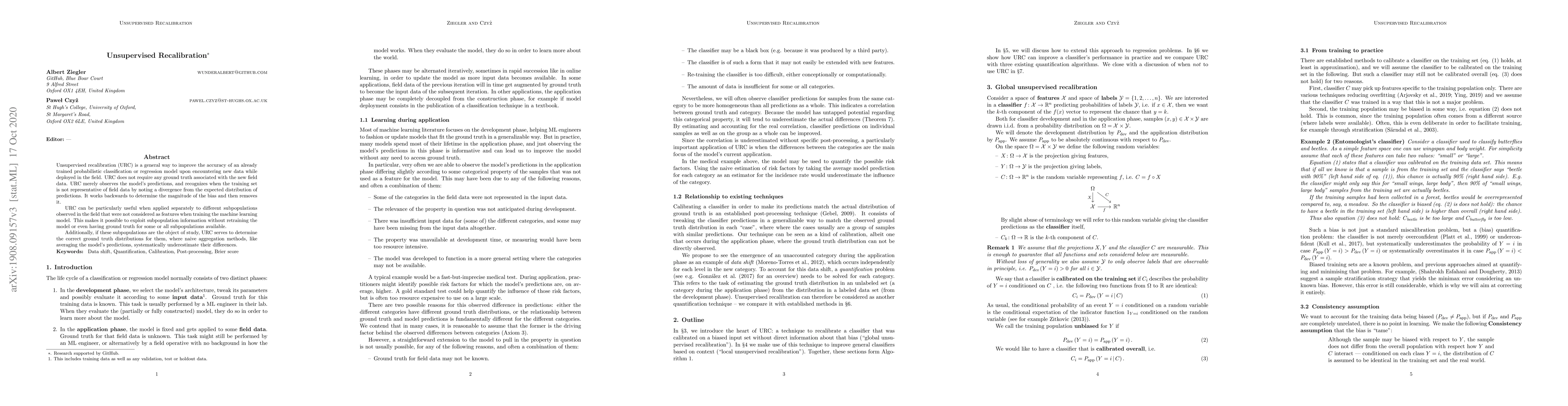 Unsupervised recalibration (URC) is a general way to improve the accuracy of an already trained probabilistic classification or regression model upon encountering new data while deployed in the field. URC does not require any ground truth associated with the new field data. URC merely observes the model's predictions and recognizes when the training set is not representative of field data, and then corrects to remove any introduced bias. URC can be particularly useful when applied separately to different subpopulations observed in the field that were not considered as features when training the machine learning model. This makes it possible to exploit subpopulation information without retraining the model or even having ground truth for some or all subpopulations available. Additionally, if these subpopulations are the object of study, URC serves to determine the correct ground truth distributions for them, where naive aggregation methods, like averaging the model's predictions, systematically underestimate their differences.