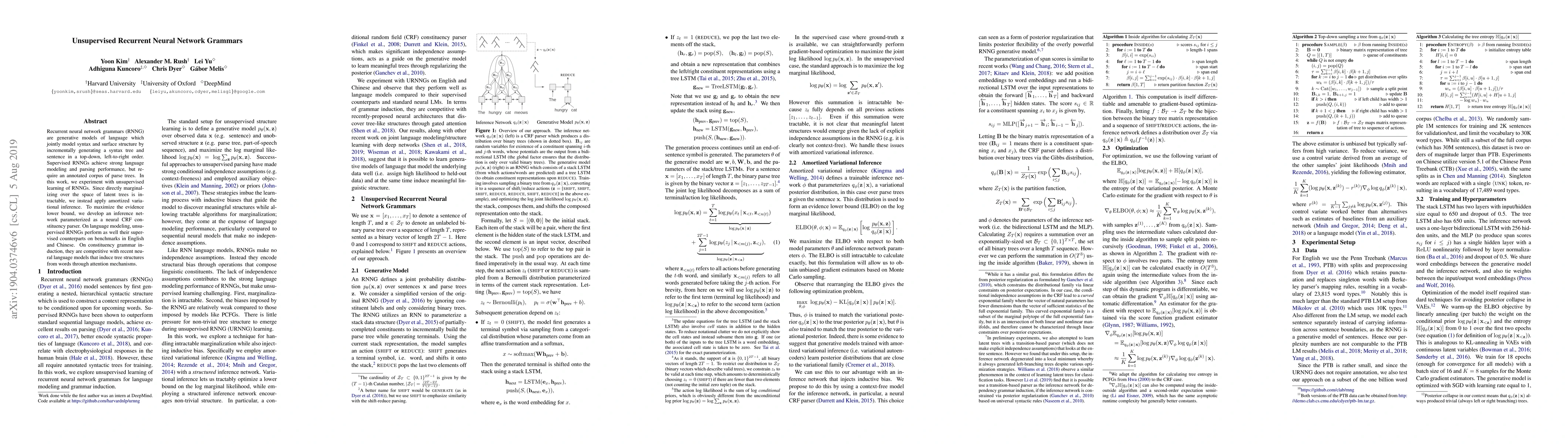 This paper explores unsupervised learning of recurrent neural network grammars (RNNGs) using amortized variational inference, achieving performance comparable to supervised RNNGs on language modeling and competitive results on constituency grammar induction.
