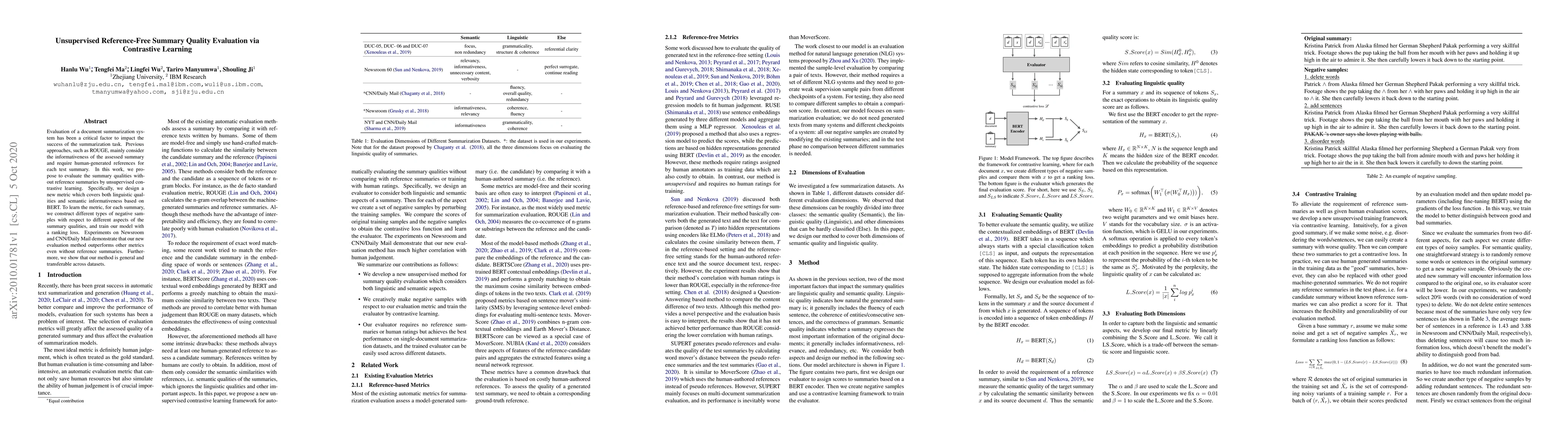 This paper proposes an unsupervised method for evaluating document summarization quality using contrastive learning, without requiring human-generated reference summaries. It introduces a new metric based on BERT, trained with negative samples to assess both linguistic and semantic qualities, outperforming existing metrics on Newsroom and CNN/Daily Mail datasets.
