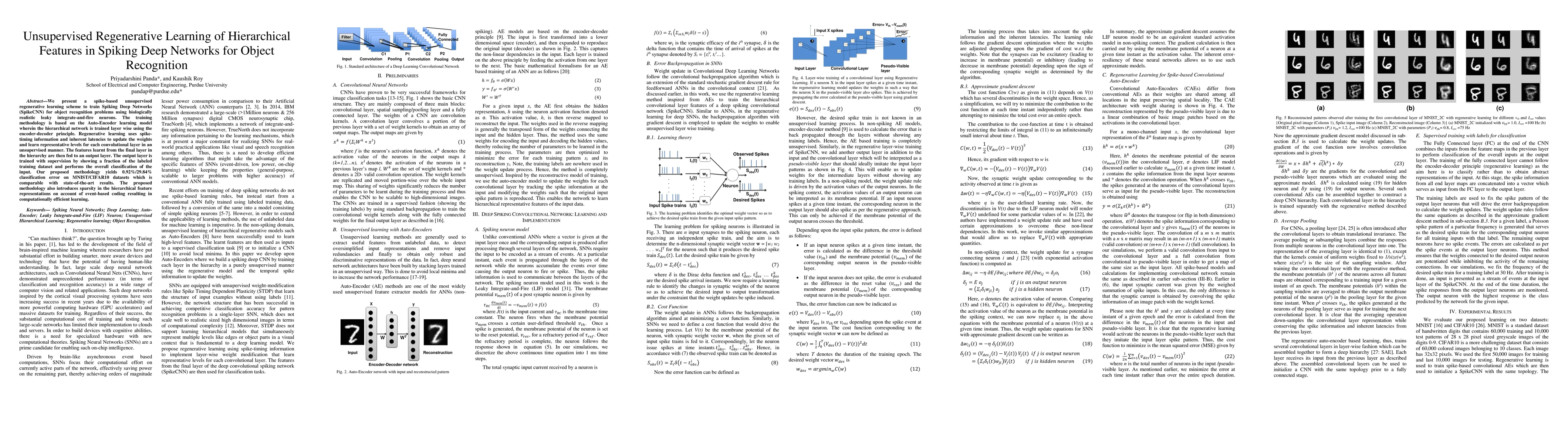 We present a spike-based unsupervised regenerative learning scheme to train Spiking Deep Networks (SpikeCNN) for object recognition problems using biologically realistic leaky integrate-and-fire neurons. The training methodology is based on the Auto-Encoder learning model wherein the hierarchical network is trained layer wise using the encoder-decoder principle. Regenerative learning uses spike-timing information and inherent latencies to update the weights and learn representative levels for each convolutional layer in an unsupervised manner. The features learnt from the final layer in the hierarchy are then fed to an output layer. The output layer is trained with supervision by showing a fraction of the labeled training dataset and performs the overall classification of the input. Our proposed methodology yields 0.92%/29.84% classification error on MNIST/CIFAR10 datasets which is comparable with state-of-the-art results. The proposed methodology also introduces sparsity in the hierarchical feature representations on account of event-based coding resulting in computationally efficient learning.