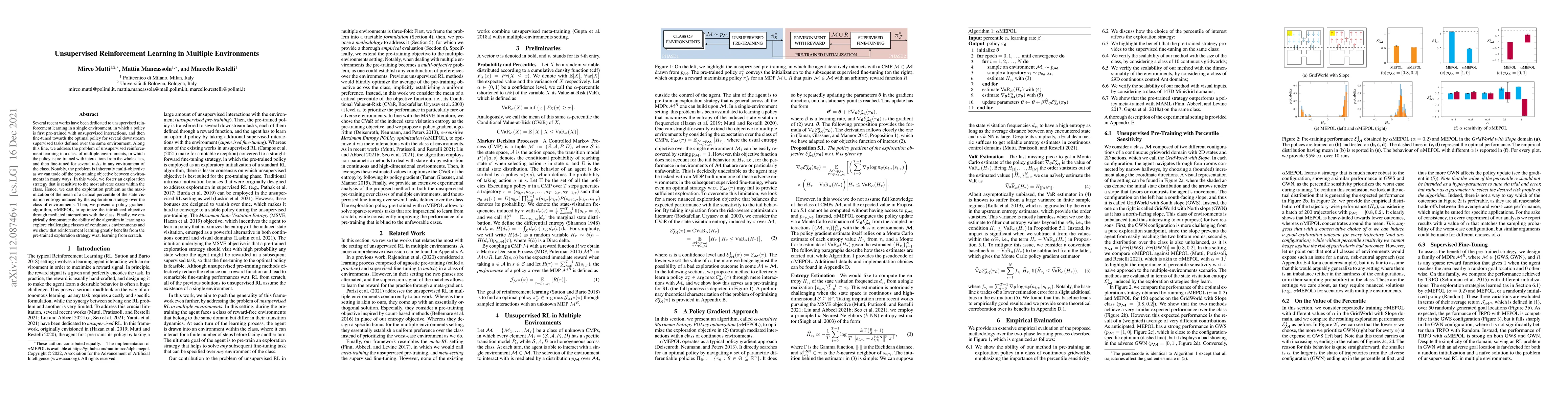 This paper proposes an unsupervised reinforcement learning approach for policies pre-trained across multiple environments, optimizing an exploration strategy that maximizes the state visitation entropy to handle adverse cases. The $\alpha$MEPOL algorithm is introduced to achieve this, demonstrating improved performance in continuous environment tasks compared to learning from scratch.