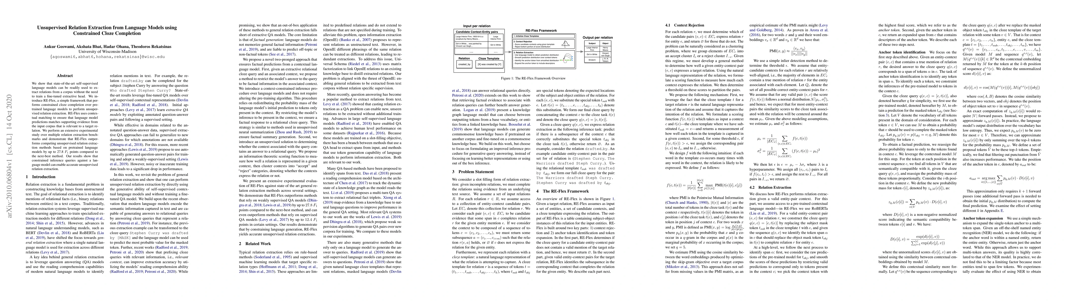 This paper presents RE-Flex, an unsupervised framework using constrained cloze completion over pretrained language models to extract relations from a corpus without fine-tuning. Experiments demonstrate RE-Flex outperforms other methods by up to 27.8 $F_1$ points, showing that language model inference queries can achieve accurate unsupervised relation extraction.