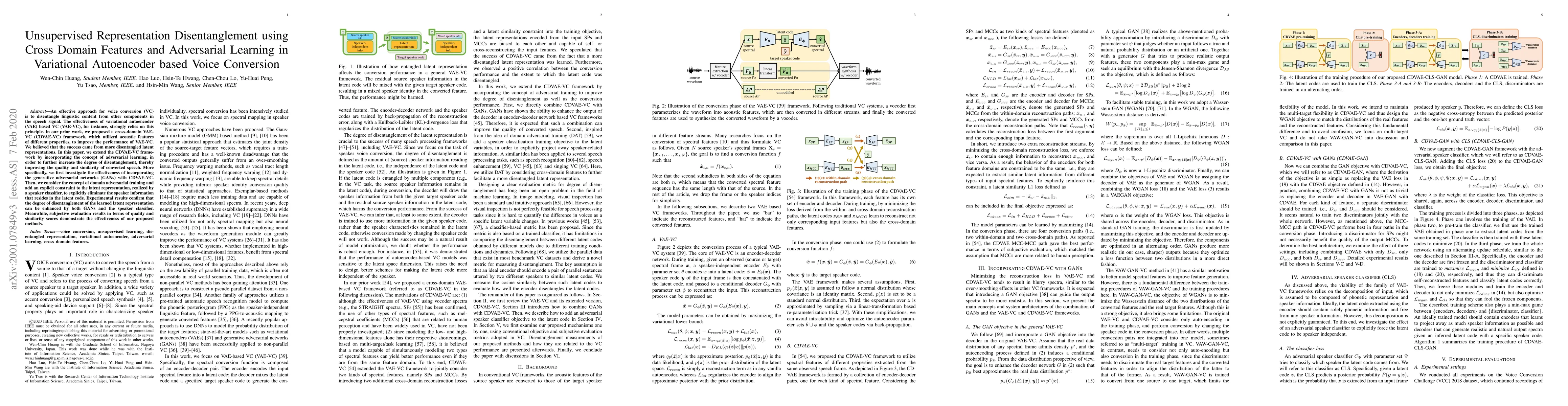 This paper proposes an enhanced unsupervised voice conversion framework using a cross-domain variational autoencoder (CDVAE-VC) with adversarial learning to improve disentanglement of linguistic content from other speech components. The integration of generative adversarial networks (GANs) and domain adversarial training further refines latent representations, resulting in higher quality and more similar converted speech.