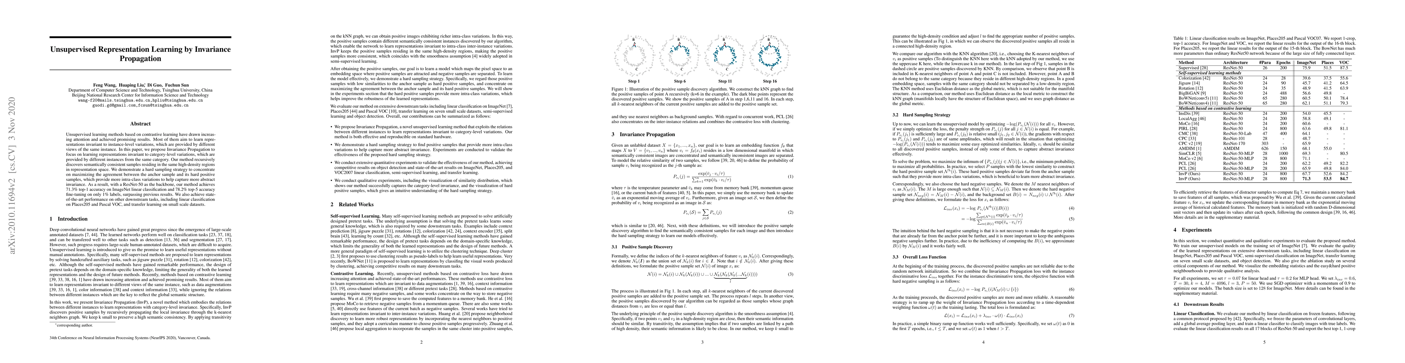 This paper proposes Invariance Propagation, an unsupervised representation learning method that focuses on learning representations invariant to category-level variations by discovering semantically consistent samples. It achieves state-of-the-art performance on ImageNet, Places205, Pascal VOC, and small scale datasets through a hard sampling strategy.