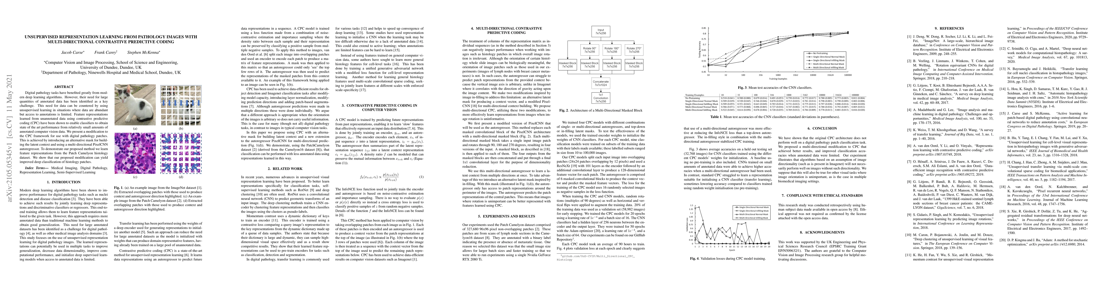 This paper proposes an unsupervised learning method using multi-directional contrastive predictive coding (CPC) for feature representation from pathology images. The method introduces an alternative mask and a multi-directional PixelCNN autoregressor to improve classification performance on the Patch Camelyon histology dataset.