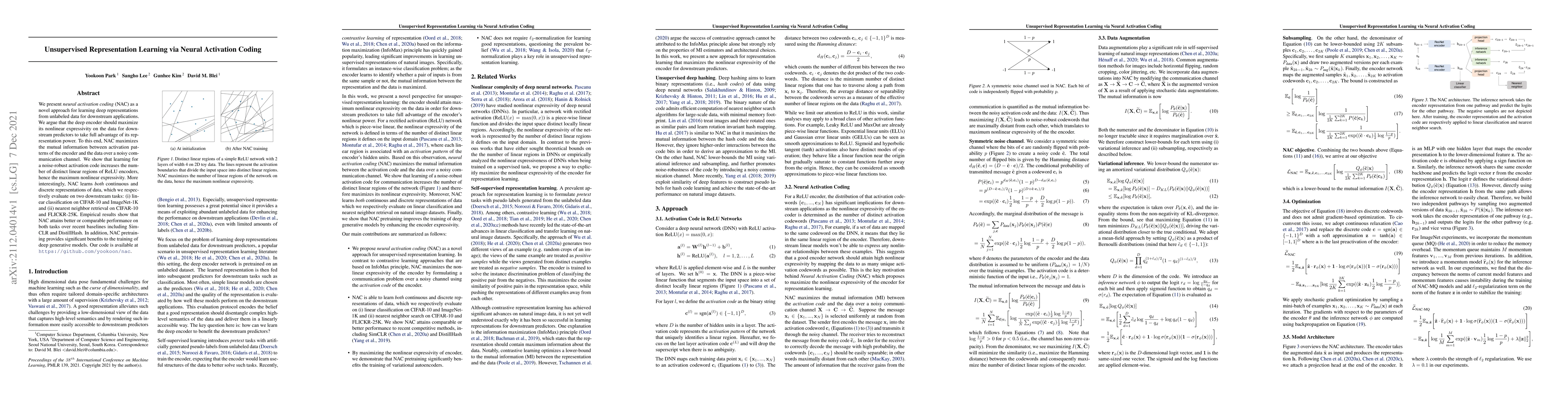 We present neural activation coding (NAC) as a novel approach for learning deep representations from unlabeled data for downstream applications. We argue that the deep encoder should maximize its nonlinear expressivity on the data for downstream predictors to take full advantage of its representation power. To this end, NAC maximizes the mutual information between activation patterns of the encoder and the data over a noisy communication channel. We show that learning for a noise-robust activation code increases the number of distinct linear regions of ReLU encoders, hence the maximum nonlinear expressivity. More interestingly, NAC learns both continuous and discrete representations of data, which we respectively evaluate on two downstream tasks: (i) linear classification on CIFAR-10 and ImageNet-1K and (ii) nearest neighbor retrieval on CIFAR-10 and FLICKR-25K. Empirical results show that NAC attains better or comparable performance on both tasks over recent baselines including SimCLR and DistillHash. In addition, NAC pretraining provides significant benefits to the training of deep generative models. Our code is available at https://github.com/yookoon/nac.