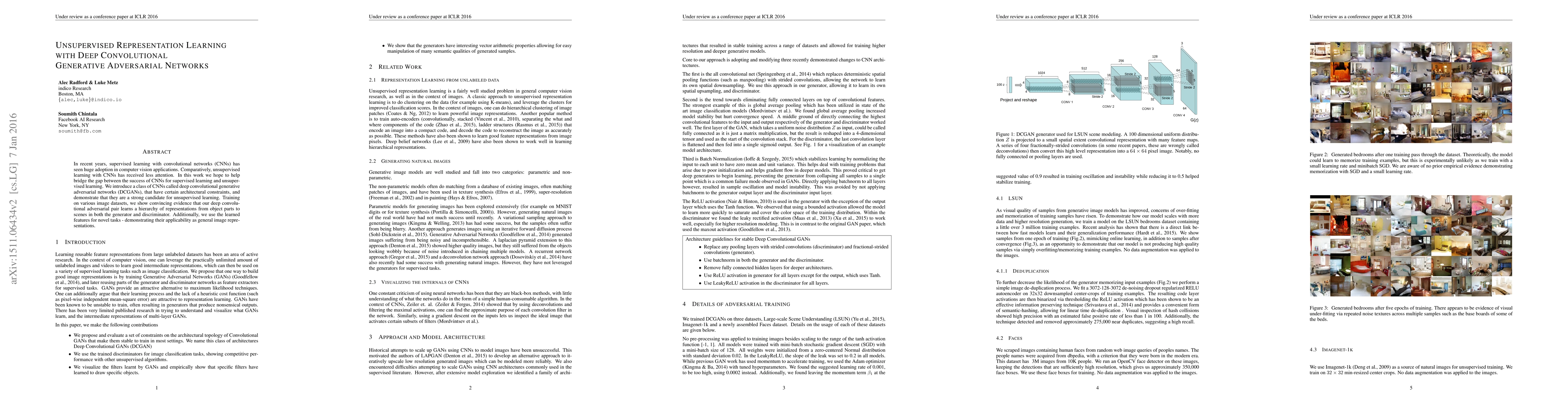 This paper introduces deep convolutional generative adversarial networks (DCGANs) to bridge the gap between supervised and unsupervised learning in computer vision. The authors demonstrate that DCGANs effectively learn hierarchical representations from image datasets, which can be applied to novel tasks, showcasing their potential as general image representations.