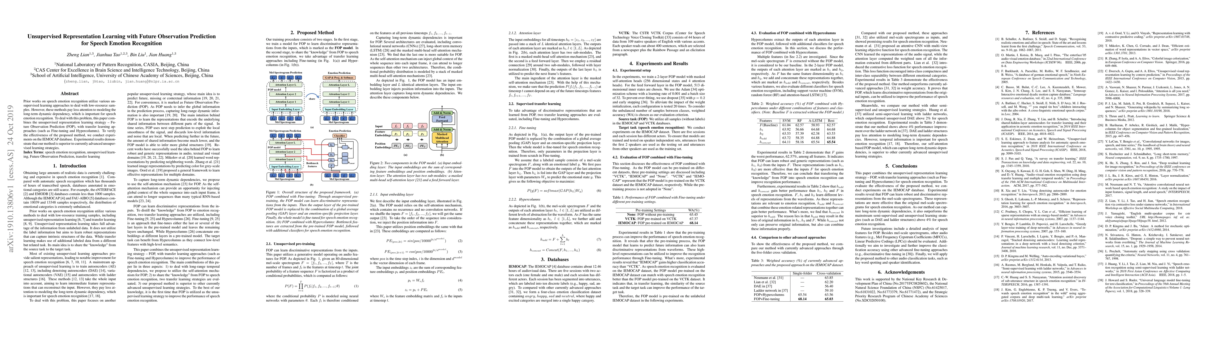 This paper proposes an unsupervised representation learning method using Future Observation Prediction (FOP) combined with transfer learning for speech emotion recognition, addressing the lack of long-term dynamic dependency modeling. Experiments on the IEMOCAP database show superior performance compared to existing unsupervised methods.
