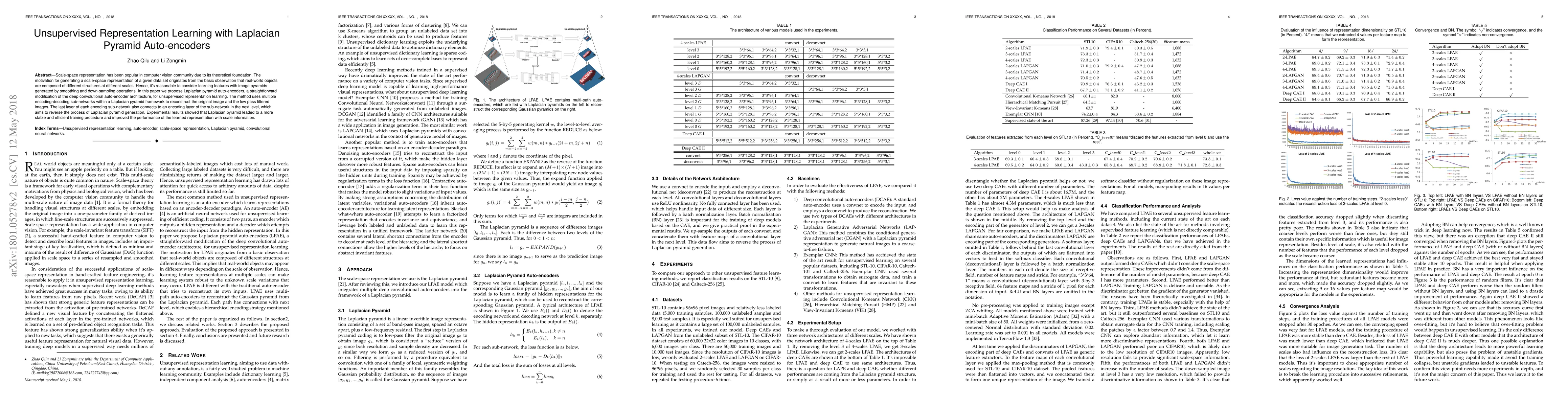 This paper proposes Laplacian pyramid auto-encoders for unsupervised representation learning, utilizing multiple encoding-decoding networks to reconstruct images and their smoothed versions. The method showed improved classification and reconstruction performance, with batch normalization aiding deep learning.