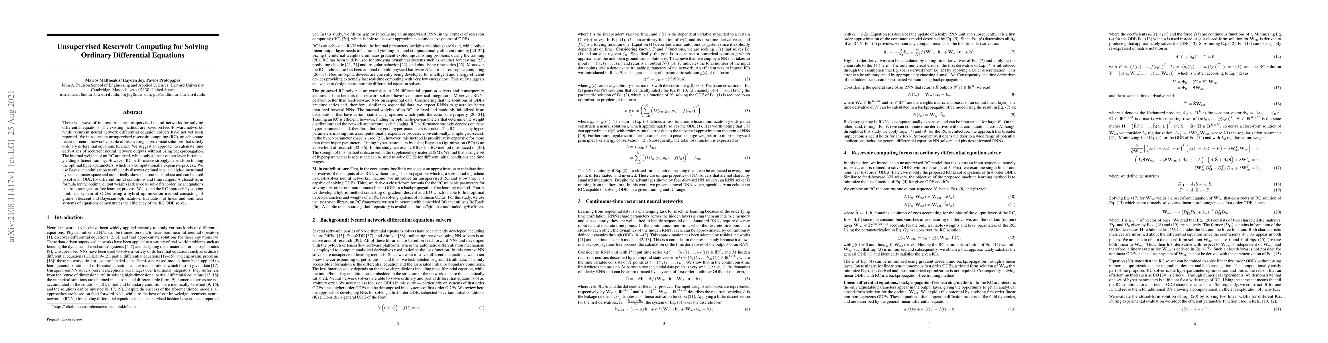This paper introduces an unsupervised reservoir computing method for solving ordinary differential equations (ODEs) using echo-state recurrent neural networks. The approach efficiently trains the model by fixing internal weights and only training a linear output layer, and employs Bayesian optimization to find optimal hyperparameters.