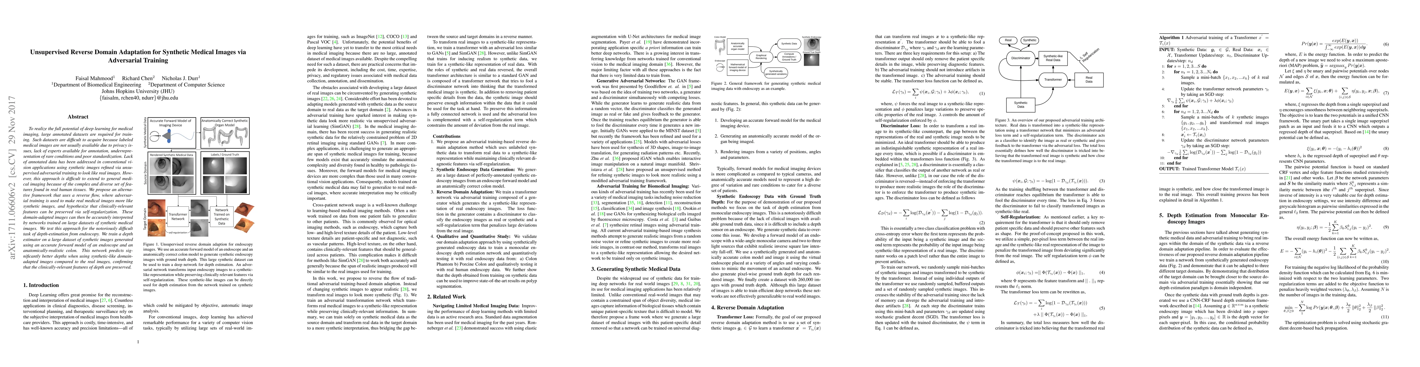 To realize the full potential of deep learning for medical imaging, large annotated datasets are required for training. Such datasets are difficult to acquire because labeled medical images are not usually available due to privacy issues, lack of experts available for annotation, underrepresentation of rare conditions and poor standardization. Lack of annotated data has been addressed in conventional vision applications using synthetic images refined via unsupervised adversarial training to look like real images. However, this approach is difficult to extend to general medical imaging because of the complex and diverse set of features found in real human tissues. We propose an alternative framework that uses a reverse flow, where adversarial training is used to make real medical images more like synthetic images, and hypothesize that clinically-relevant features can be preserved via self-regularization. These domain-adapted images can then be accurately interpreted by networks trained on large datasets of synthetic medical images. We test this approach for the notoriously difficult task of depth-estimation from endoscopy. We train a depth estimator on a large dataset of synthetic images generated using an accurate forward model of an endoscope and an anatomically-realistic colon. This network predicts significantly better depths when using synthetic-like domain-adapted images compared to the real images, confirming that the clinically-relevant features of depth are preserved.