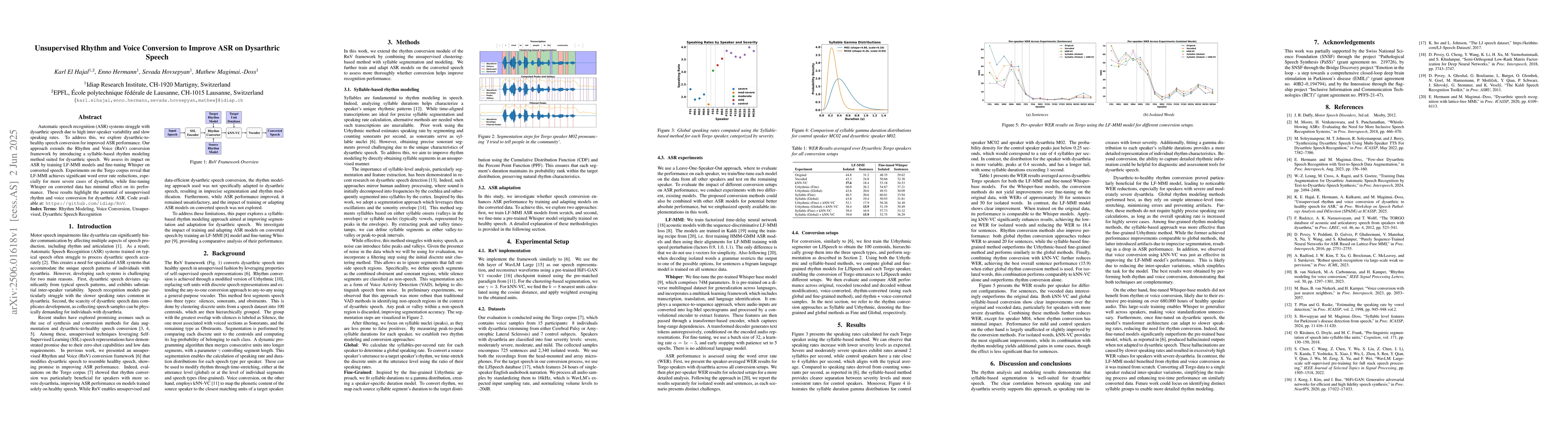 The introduction of a syllable-based rhythm modeling method for dysarthric speech within the RnV conversion framework.