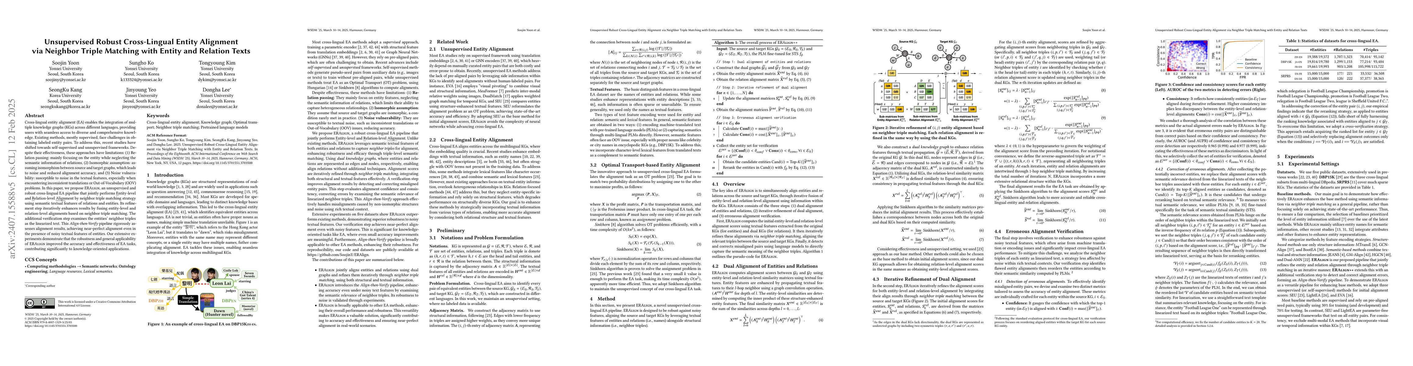 This paper introduces ERAlign, an unsupervised framework for robust cross-lingual entity alignment that jointly models entities and relations using semantic textual features. It refines alignments through an iterative "Align-and-Verify" process, achieving high accuracy even with noisy data, thus improving the effectiveness of knowledge graph integration.