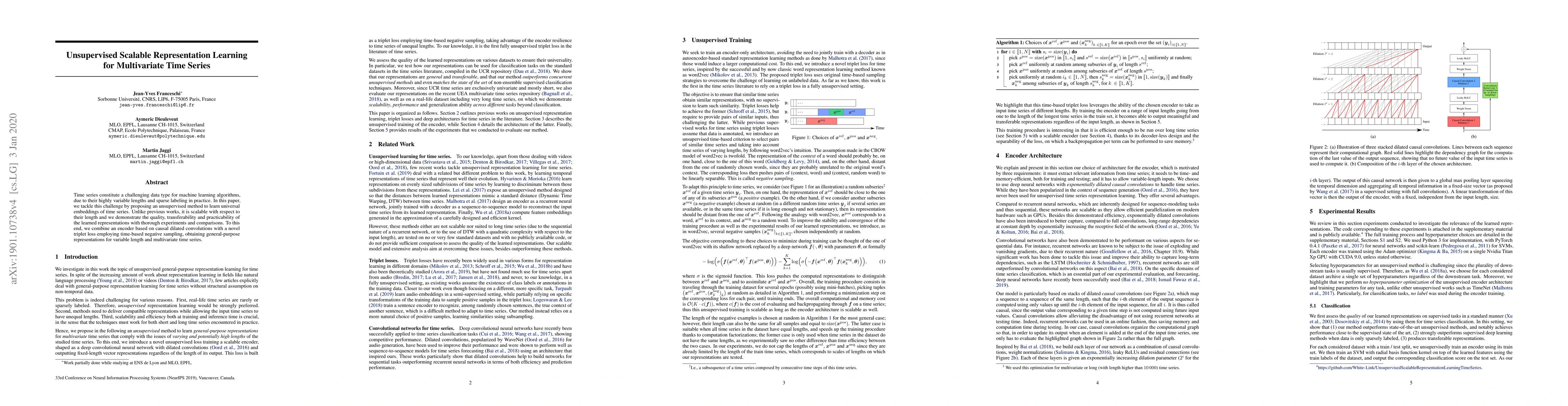 This paper proposes an unsupervised method for scalable representation learning of multivariate time series, utilizing causal dilated convolutions and a novel triplet loss with time-based negative sampling to achieve scalable, transferable, and practical embeddings for variable-length time series. Experiments demonstrate the effectiveness of the proposed approach.