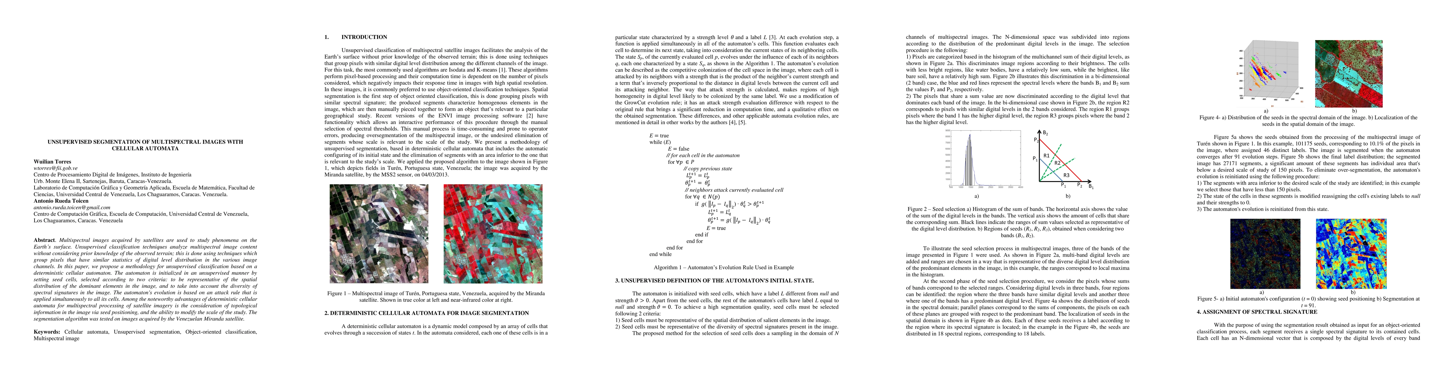 Multispectral images acquired by satellites are used to study phenomena on the Earth's surface. Unsupervised classification techniques analyze multispectral image content without considering prior knowledge of the observed terrain; this is done using techniques which group pixels that have similar statistics of digital level distribution in the various image channels. In this paper, we propose a methodology for unsupervised classification based on a deterministic cellular automaton. The automaton is initialized in an unsupervised manner by setting seed cells, selected according to two criteria: to be representative of the spatial distribution of the dominant elements in the image, and to take into account the diversity of spectral signatures in the image. The automaton's evolution is based on an attack rule that is applied simultaneously to all its cells. Among the noteworthy advantages of deterministic cellular automata for multispectral processing of satellite imagery is the consideration of topological information in the image via seed positioning, and the ability to modify the scale of the study.
