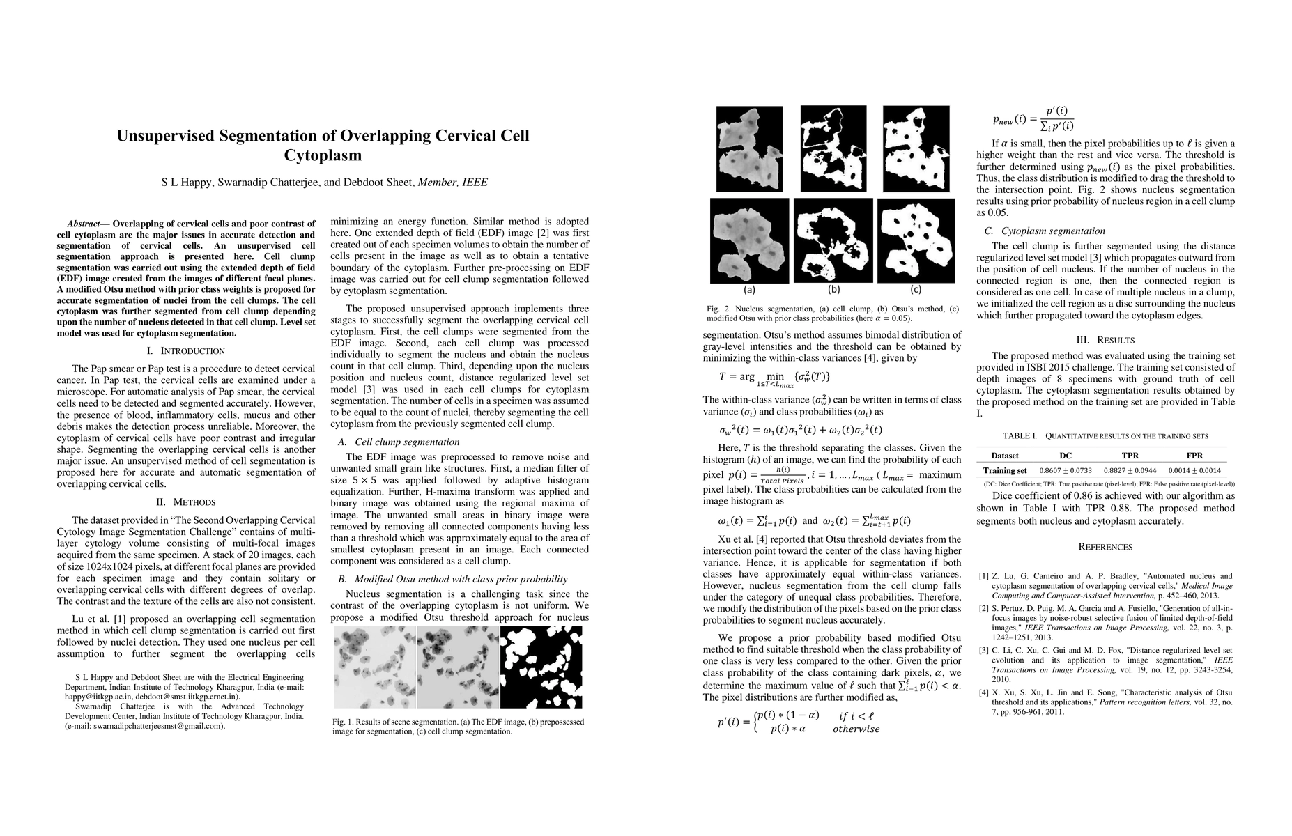 Overlapping of cervical cells and poor contrast of cell cytoplasm are the major issues in accurate detection and segmentation of cervical cells. An unsupervised cell segmentation approach is presented here. Cell clump segmentation was carried out using the extended depth of field (EDF) image created from the images of different focal planes. A modified Otsu method with prior class weights is proposed for accurate segmentation of nuclei from the cell clumps. The cell cytoplasm was further segmented from cell clump depending upon the number of nucleus detected in that cell clump. Level set model was used for cytoplasm segmentation.