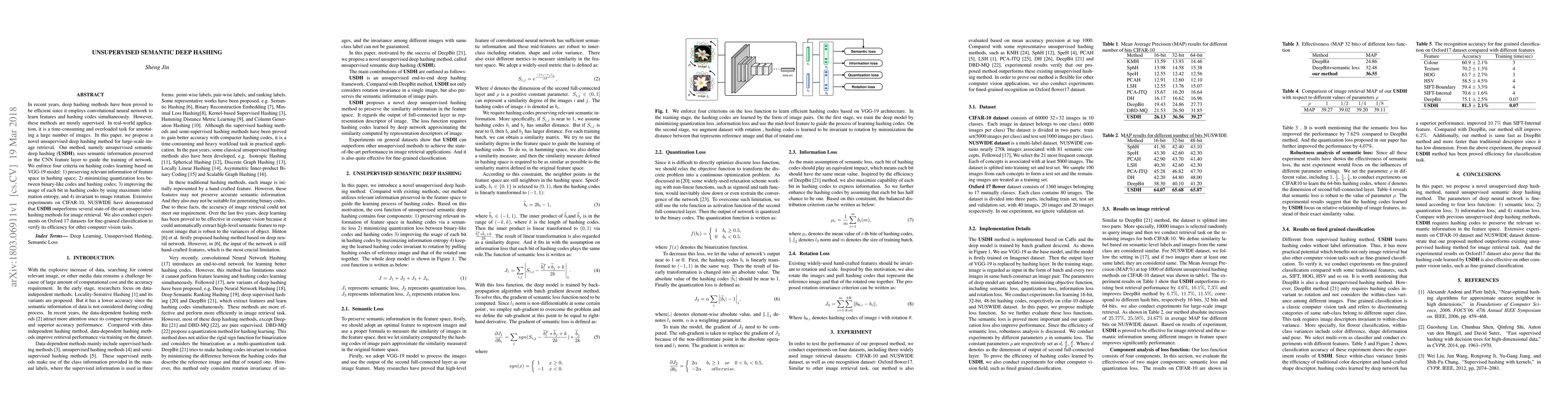 This paper introduces an unsupervised deep hashing method called Unsupervised Semantic Deep Hashing (USDH) that leverages CNN feature layers to guide network training, effectively addressing the annotation burden for large-scale image retrieval. USDH enforces criteria to preserve relevant information, minimize quantization loss, maximize information entropy, and ensure rotation invariance, outperforming other unsupervised methods in extensive experiments on CIFAR-10, NUSWIDE, and Oxford 17 datasets.