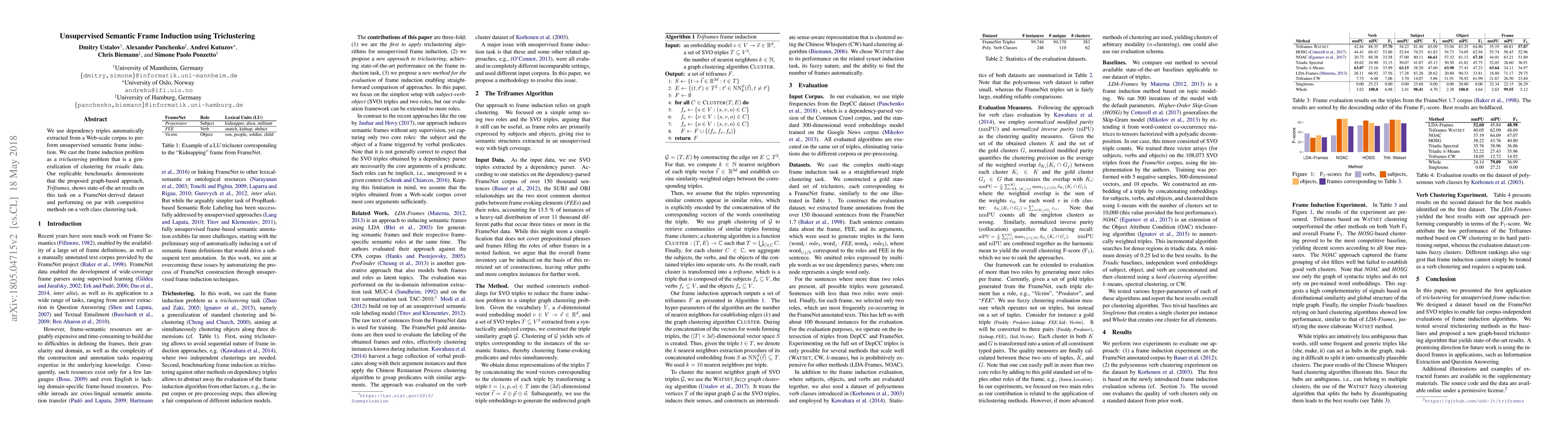 This paper proposes Triframes, an unsupervised method for semantic frame induction using triclustering on dependency triples from a large corpus. The approach achieves state-of-the-art results on a FrameNet-derived dataset and performs competitively on verb class clustering tasks.