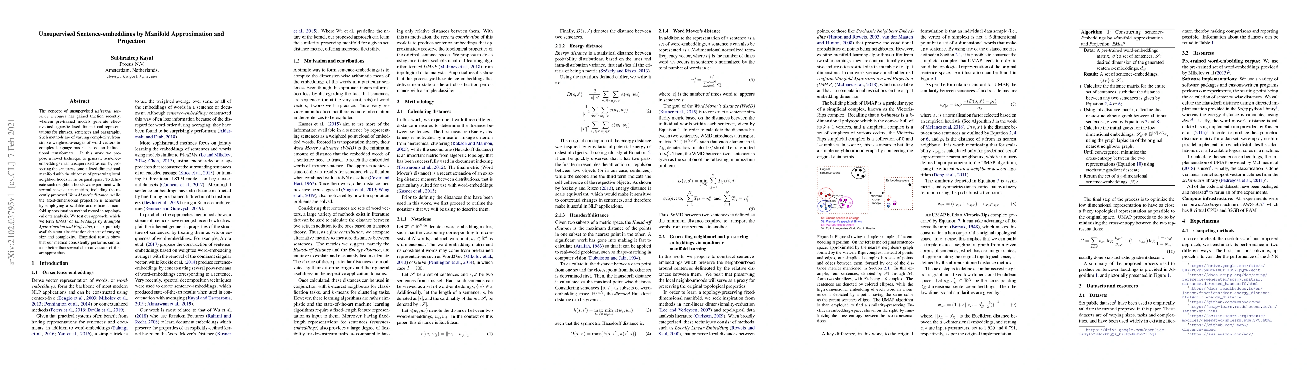 This paper proposes EMAP, a novel unsupervised method for generating sentence-embeddings by projecting sentences onto a fixed-dimensional manifold to preserve local neighborhoods. The approach uses manifold approximation and topological data analysis to achieve scalable and efficient embeddings, outperforming or matching other state-of-the-art methods on various text-classification datasets.