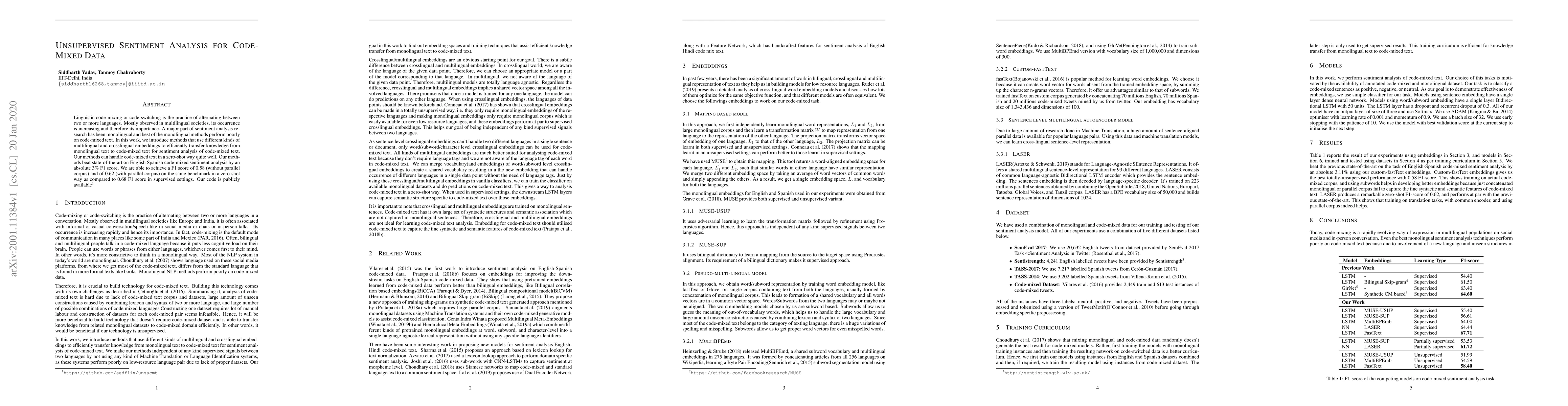This paper proposes unsupervised methods for sentiment analysis of code-mixed text using multilingual embeddings and zero-shot learning, achieving a 3% F1-score improvement over state-of-the-art. The methods perform well without a parallel corpus, scoring 0.58 F1-score and 0.62 F1-score with one, compared to 0.68 F1-score in supervised settings.