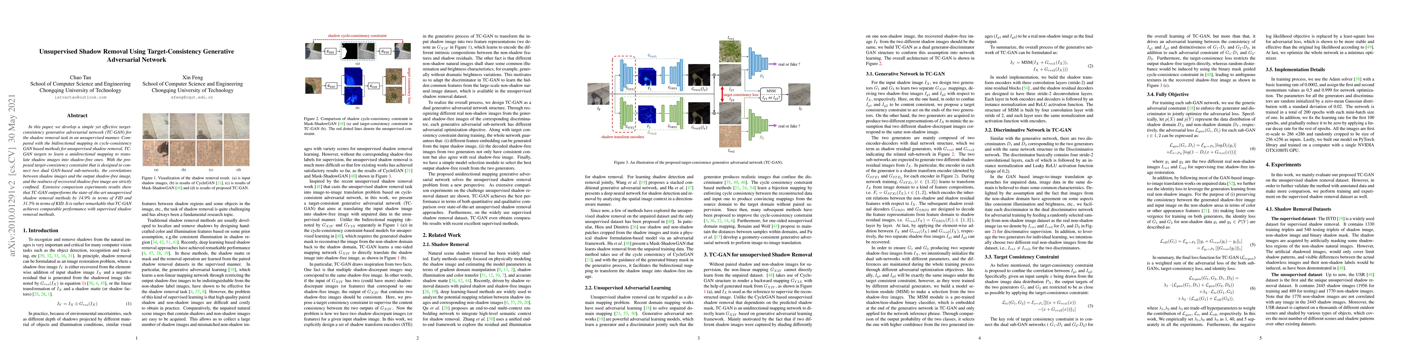 This paper introduces a target-consistency generative adversarial network (TC-GAN) for unsupervised shadow removal, achieving a one-sided mapping from shadow to non-shadow images. TC-GAN outperforms existing methods by 14.9% in FID and 31.5% in KID, demonstrating comparable performance to supervised methods.