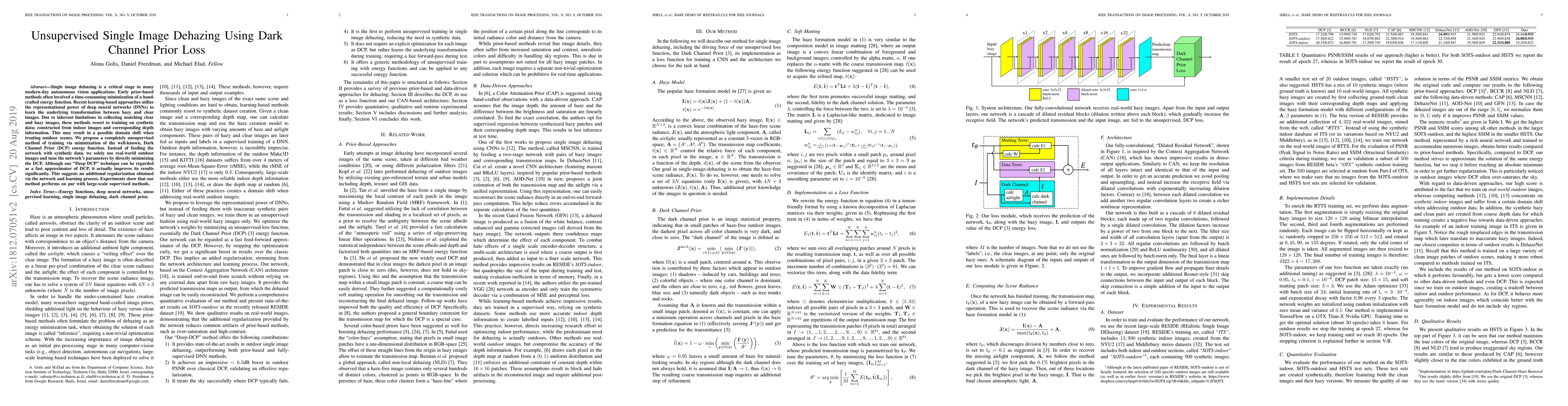 This paper proposes an unsupervised method for single image dehazing using the Dark Channel Prior (DCP) loss, trained solely on real outdoor images without synthetic data. The "Deep DCP" technique achieves results comparable to supervised methods, suggesting additional regularization from the network's learning process.
