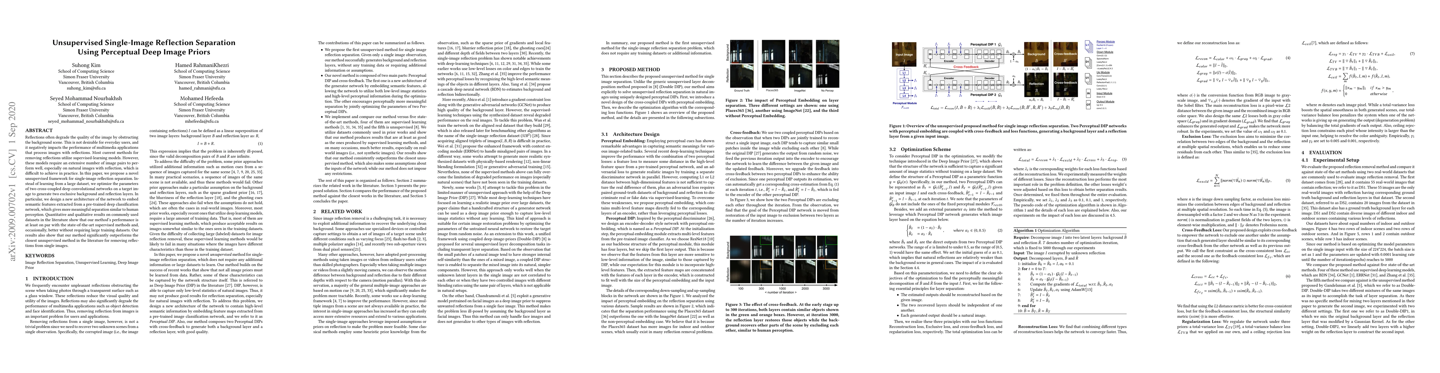 This paper introduces an unsupervised framework for separating reflections in single images using perceptual deep image priors. The proposed method optimizes two cross-coupled deep convolutional networks to generate distinct background and reflection layers, achieving performance comparable to supervised methods without requiring extensive training datasets.