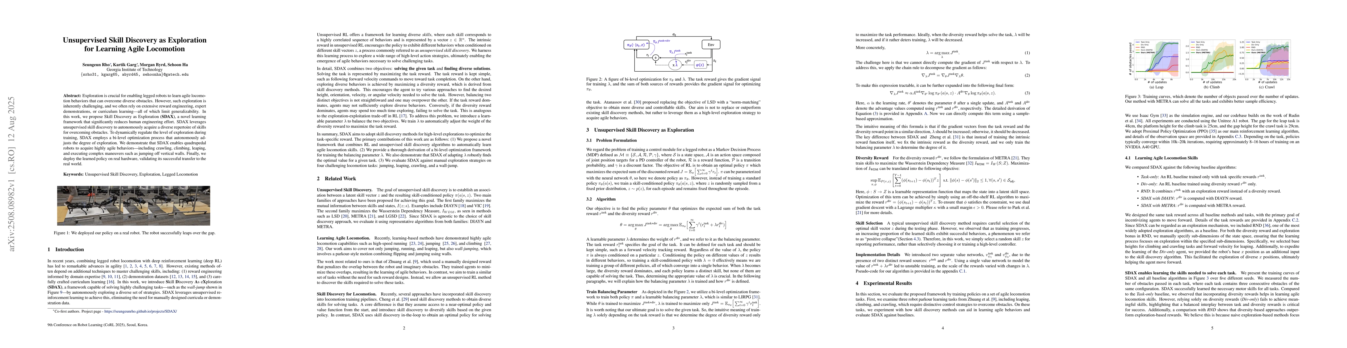 Exploration is crucial for enabling legged robots to learn agile locomotion behaviors that can overcome diverse obstacles. However, such exploration is inherently challenging, and we often rely on extensive reward engineering, expert demonstrations, or curriculum learning - all of which limit generalizability. In this work, we propose Skill Discovery as Exploration (SDAX), a novel learning framework that significantly reduces human engineering effort. SDAX leverages unsupervised skill discovery to autonomously acquire a diverse repertoire of skills for overcoming obstacles. To dynamically regulate the level of exploration during training, SDAX employs a bi-level optimization process that autonomously adjusts the degree of exploration. We demonstrate that SDAX enables quadrupedal robots to acquire highly agile behaviors including crawling, climbing, leaping, and executing complex maneuvers such as jumping off vertical walls. Finally, we deploy the learned policy on real hardware, validating its successful transfer to the real world.