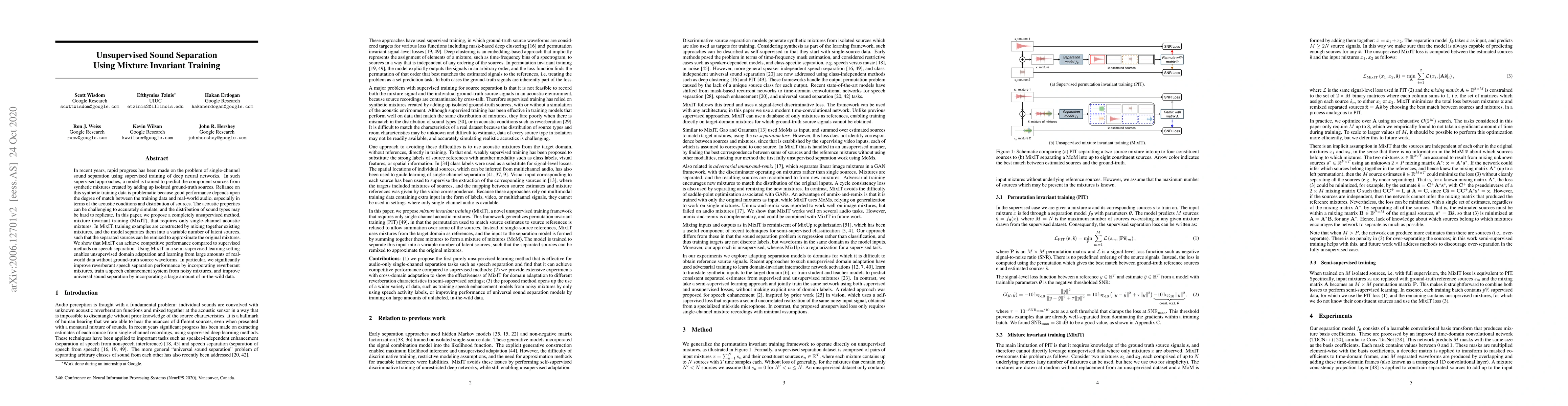 This paper introduces MixIT, an unsupervised method for sound separation that constructs training examples by mixing existing mixtures, achieving competitive performance compared to supervised methods. MixIT enables domain adaptation and learning from real-world data without ground-truth sources, notably improving reverberant speech separation and universal sound separation.