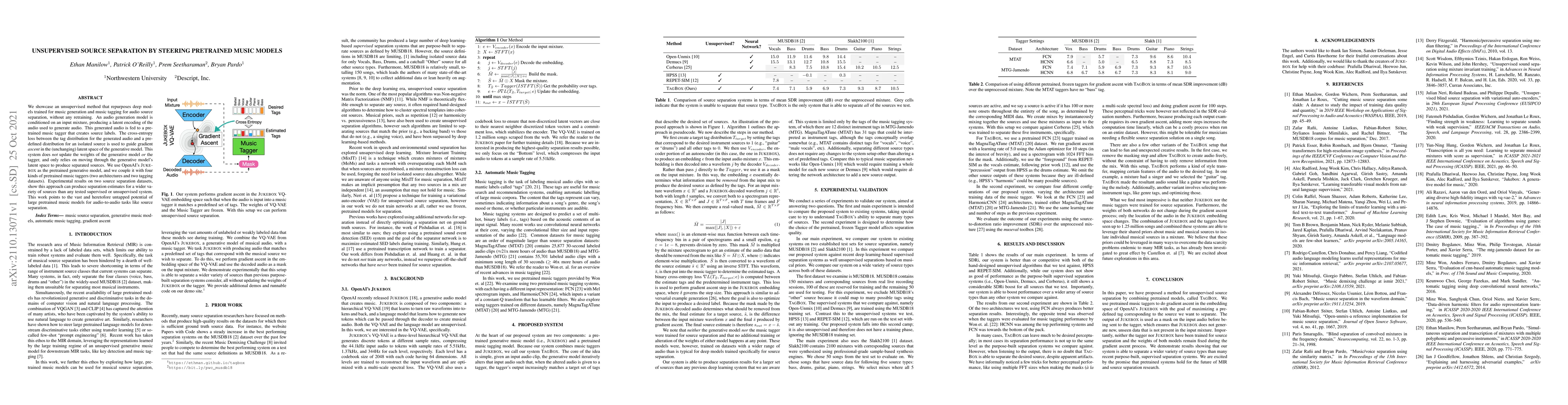 We showcase an unsupervised method that repurposes deep models trained for music generation and music tagging for audio source separation, without any retraining. An audio generation model is conditioned on an input mixture, producing a latent encoding of the audio used to generate audio. This generated audio is fed to a pretrained music tagger that creates source labels. The cross-entropy loss between the tag distribution for the generated audio and a predefined distribution for an isolated source is used to guide gradient ascent in the (unchanging) latent space of the generative model. This system does not update the weights of the generative model or the tagger, and only relies on moving through the generative model's latent space to produce separated sources. We use OpenAI's Jukebox as the pretrained generative model, and we couple it with four kinds of pretrained music taggers (two architectures and two tagging datasets). Experimental results on two source separation datasets, show this approach can produce separation estimates for a wider variety of sources than any tested supervised or unsupervised system. This work points to the vast and heretofore untapped potential of large pretrained music models for audio-to-audio tasks like source separation.