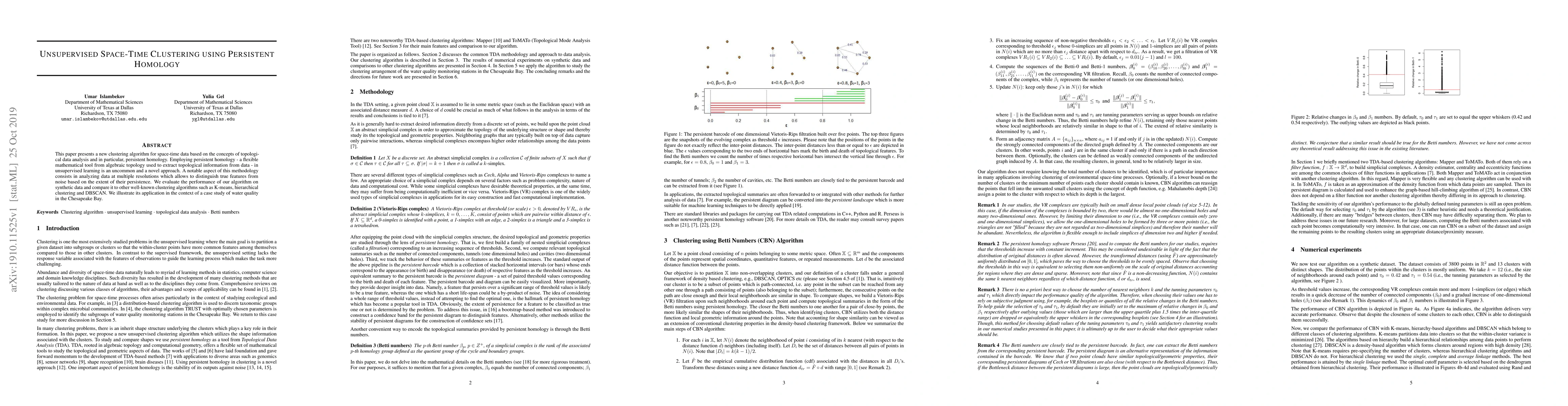 This paper introduces a novel unsupervised clustering algorithm for space-time data using persistent homology from topological data analysis. The method evaluates data at multiple resolutions to distinguish true features from noise, and is evaluated against other clustering algorithms on synthetic and real-world water quality data.
